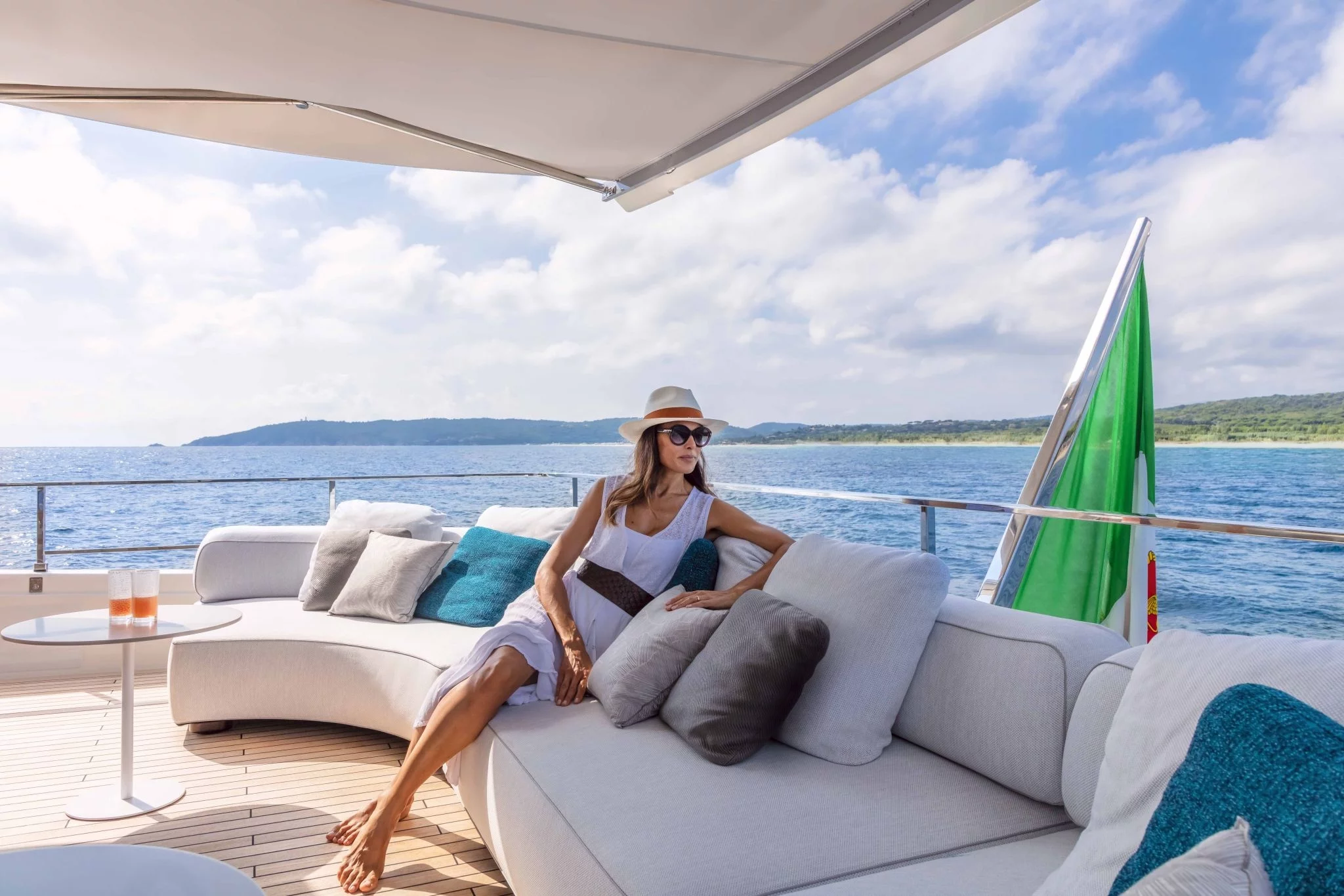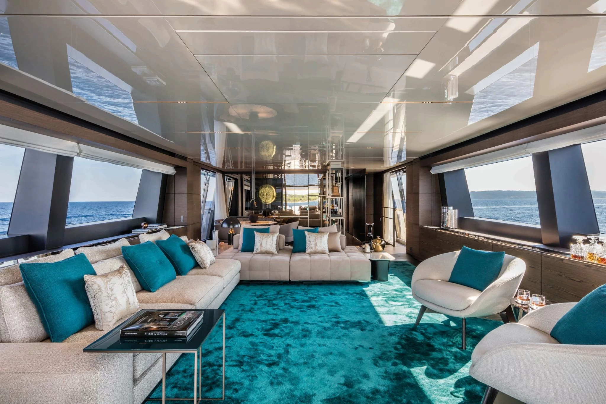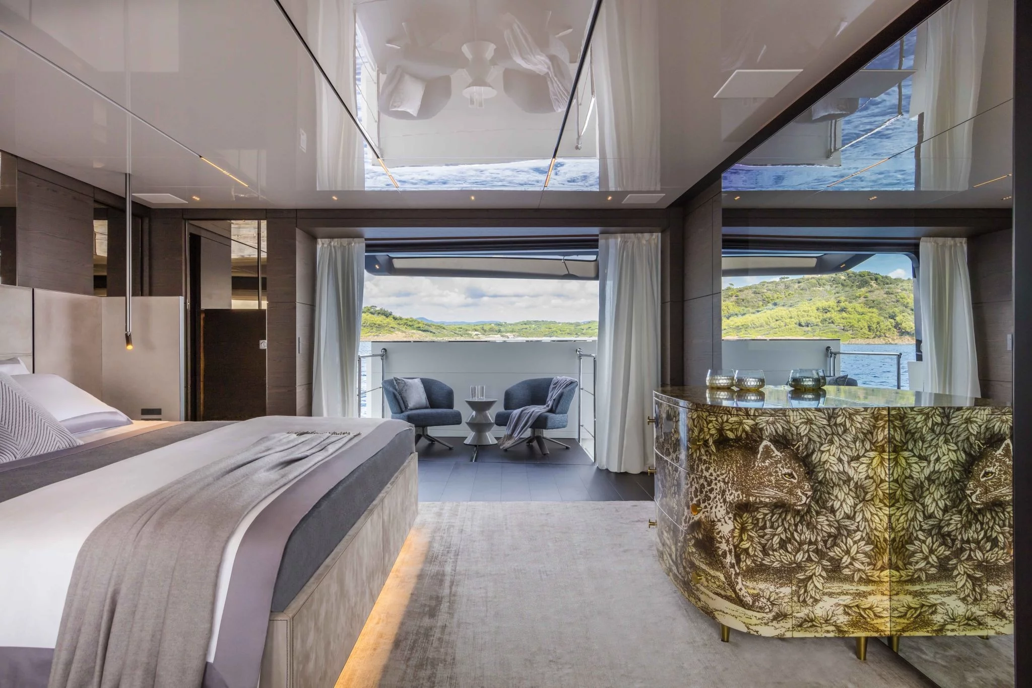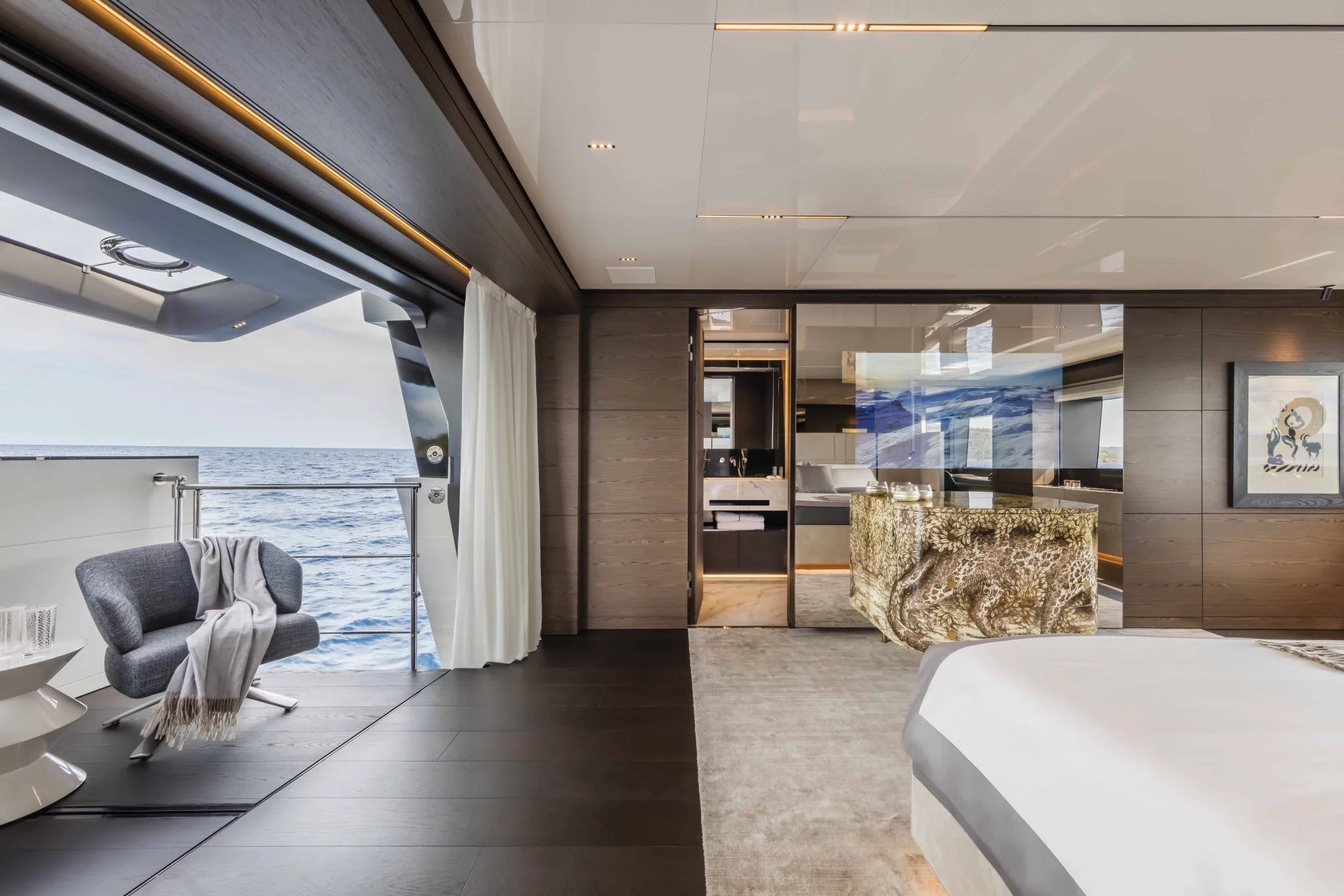 It is the brand's first model with a transatlantic range exceeding 3,000 nautical miles, allowing for extended journeys in complete comfort. The spacious layout is spread across four decks, offering customizable areas to suit the owner's preferences. The master suite, located on the main deck, provides panoramic views, while the guest cabins on the lower deck ensure luxury and privacy.