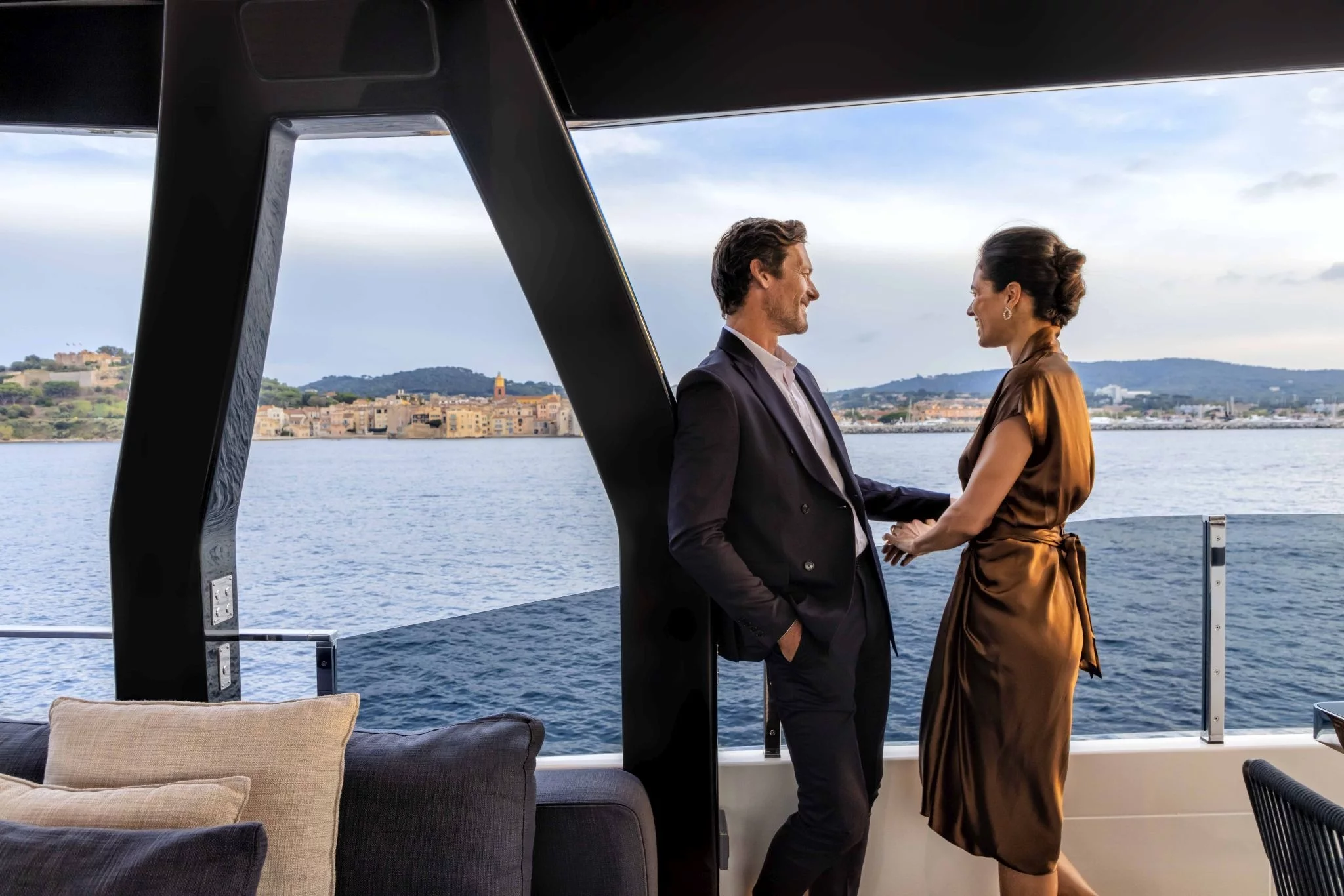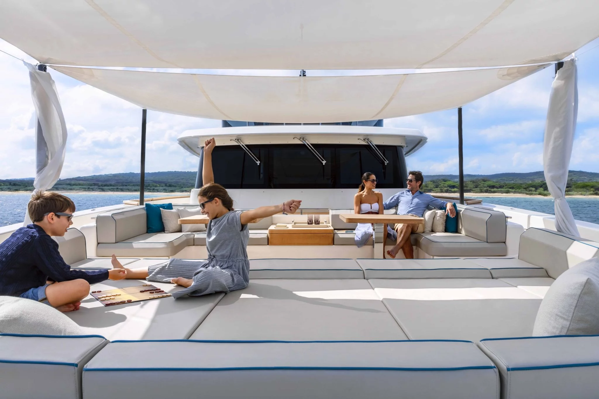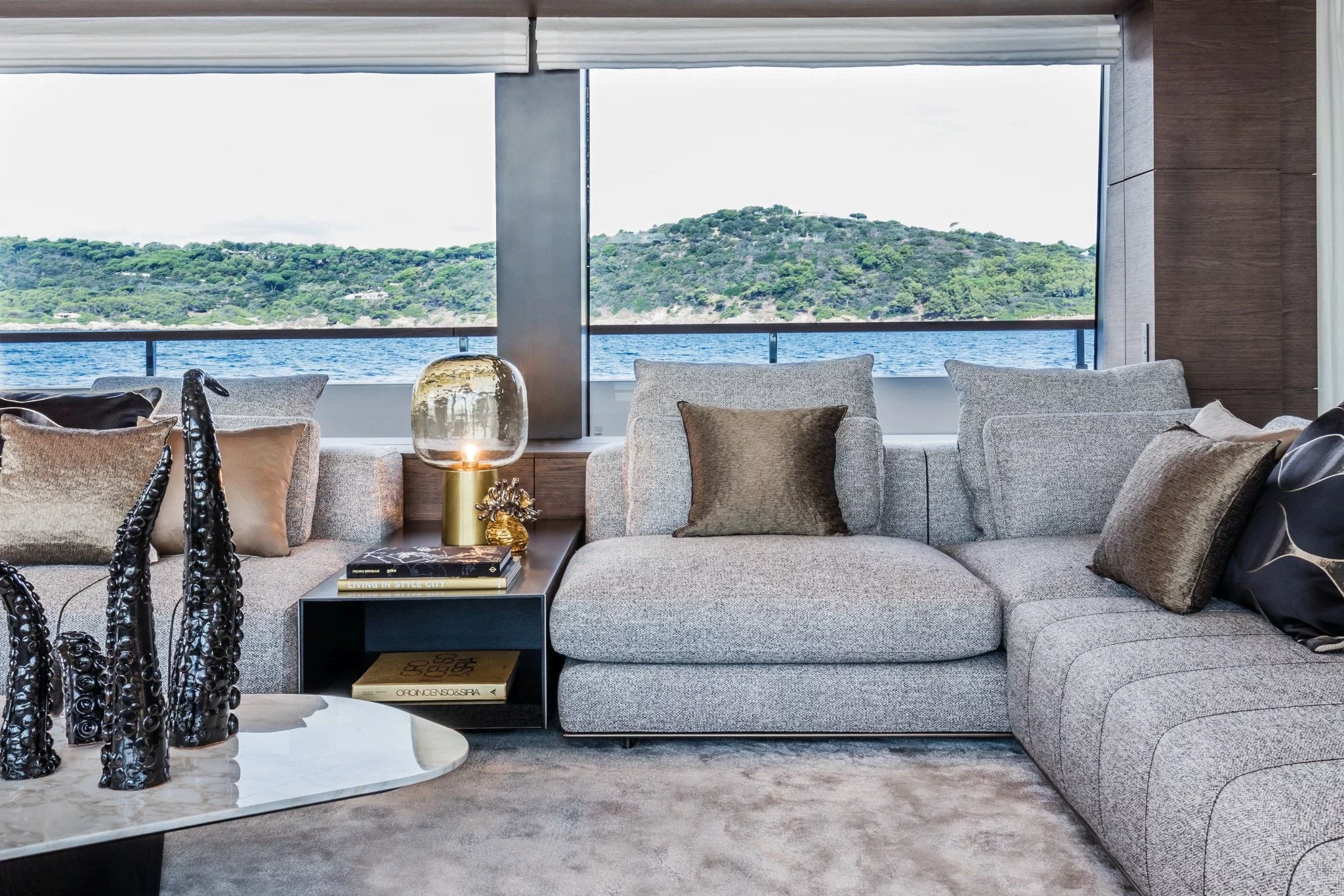 It is the brand's first model with a transatlantic range exceeding 3,000 nautical miles, allowing for extended journeys in complete comfort. The spacious layout is spread across four decks, offering customizable areas to suit the owner's preferences. The master suite, located on the main deck, provides panoramic views, while the guest cabins on the lower deck ensure luxury and privacy.