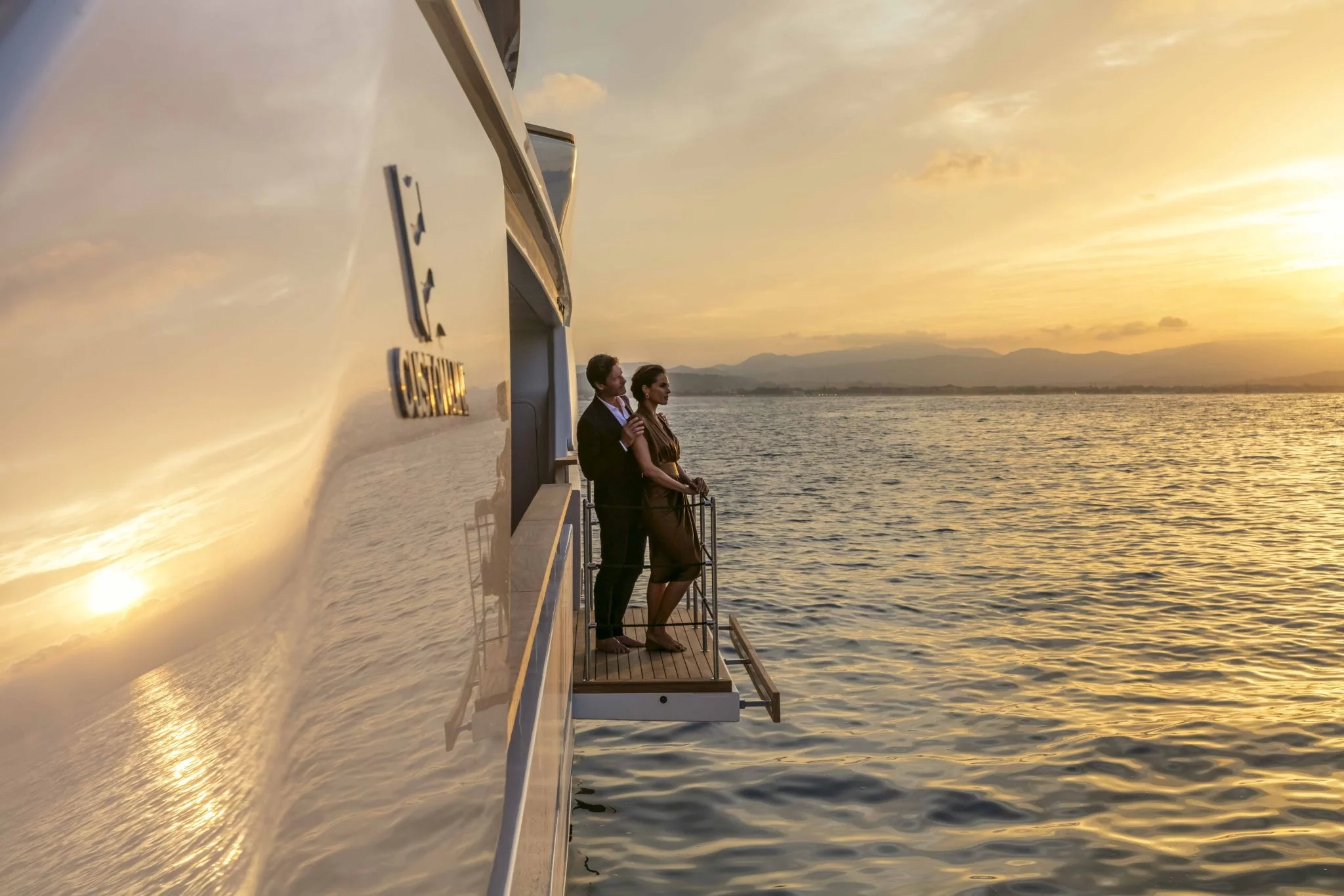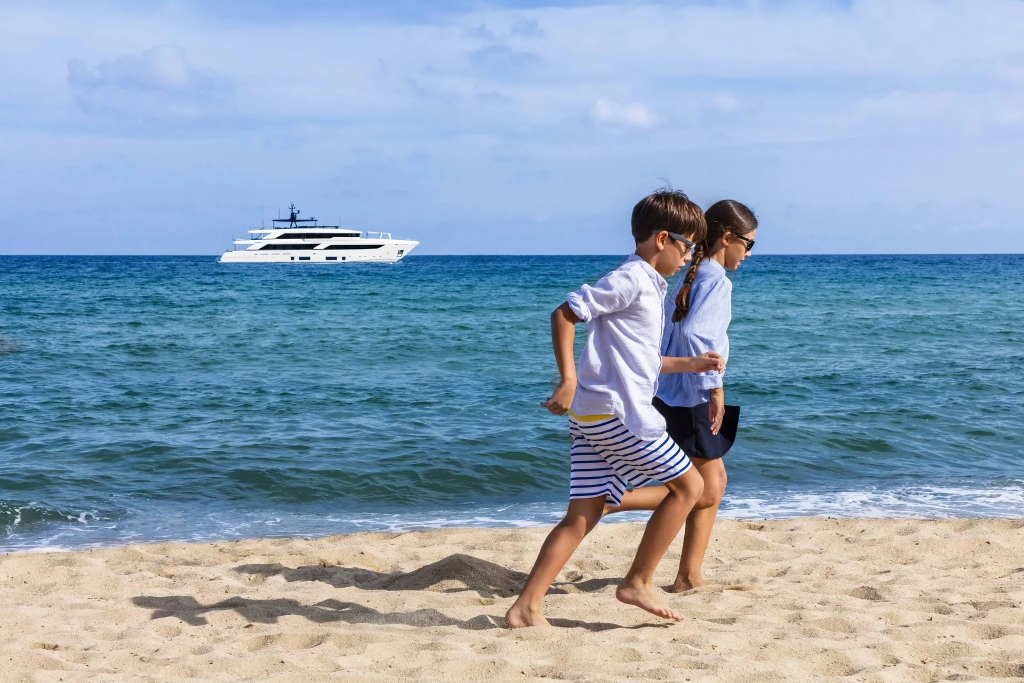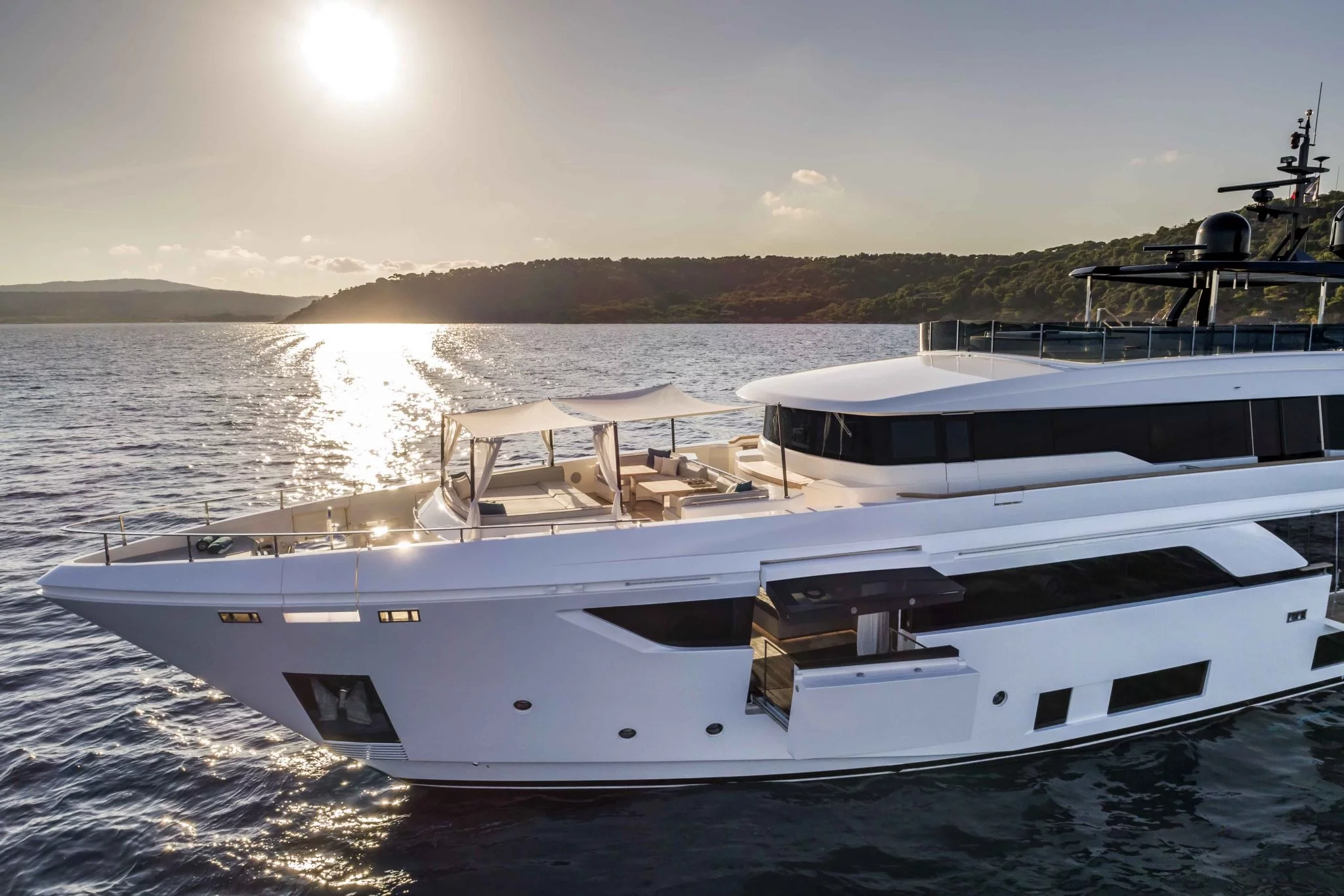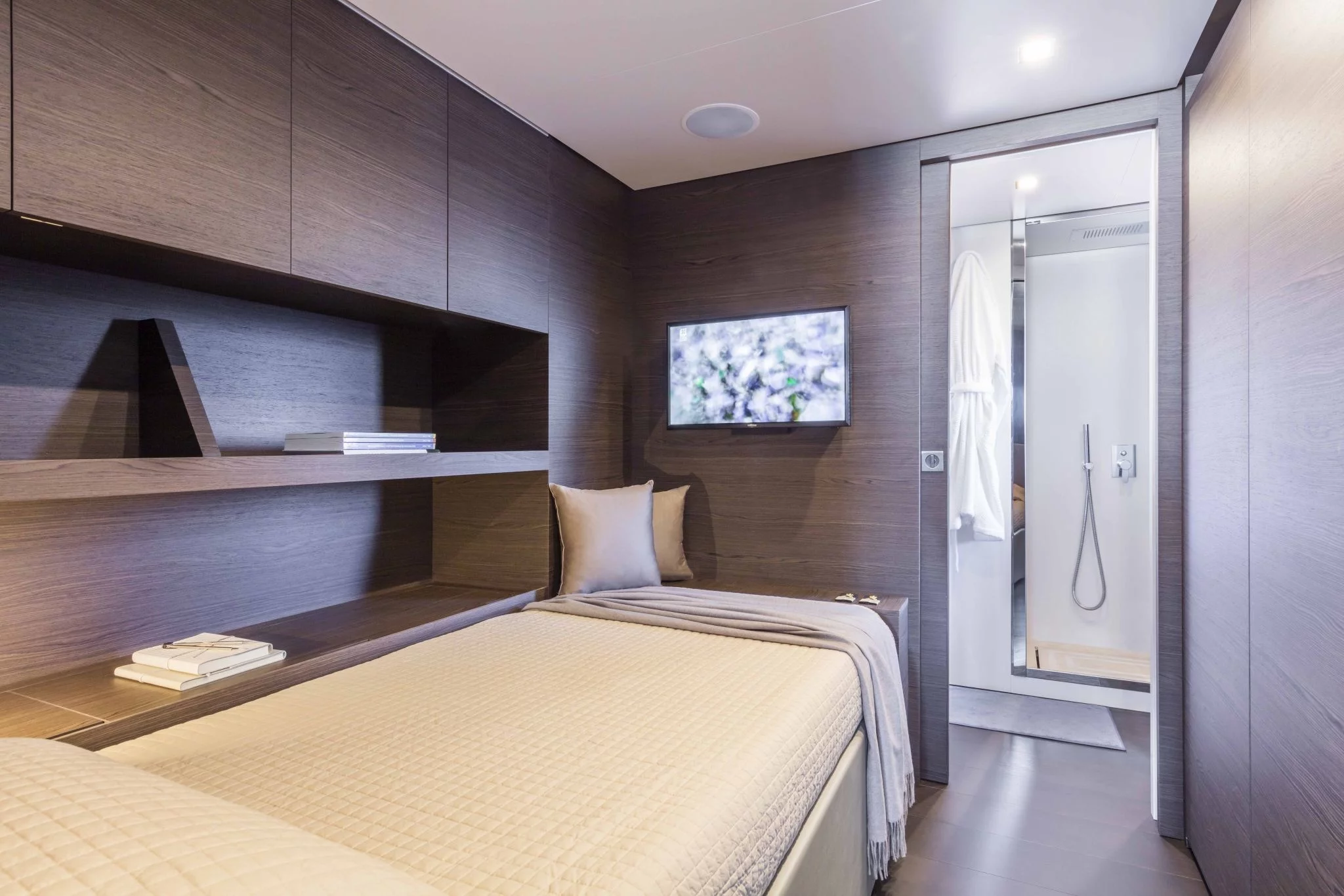 It is the brand's first model with a transatlantic range exceeding 3,000 nautical miles, allowing for extended journeys in complete comfort. The spacious layout is spread across four decks, offering customizable areas to suit the owner's preferences. The master suite, located on the main deck, provides panoramic views, while the guest cabins on the lower deck ensure luxury and privacy.