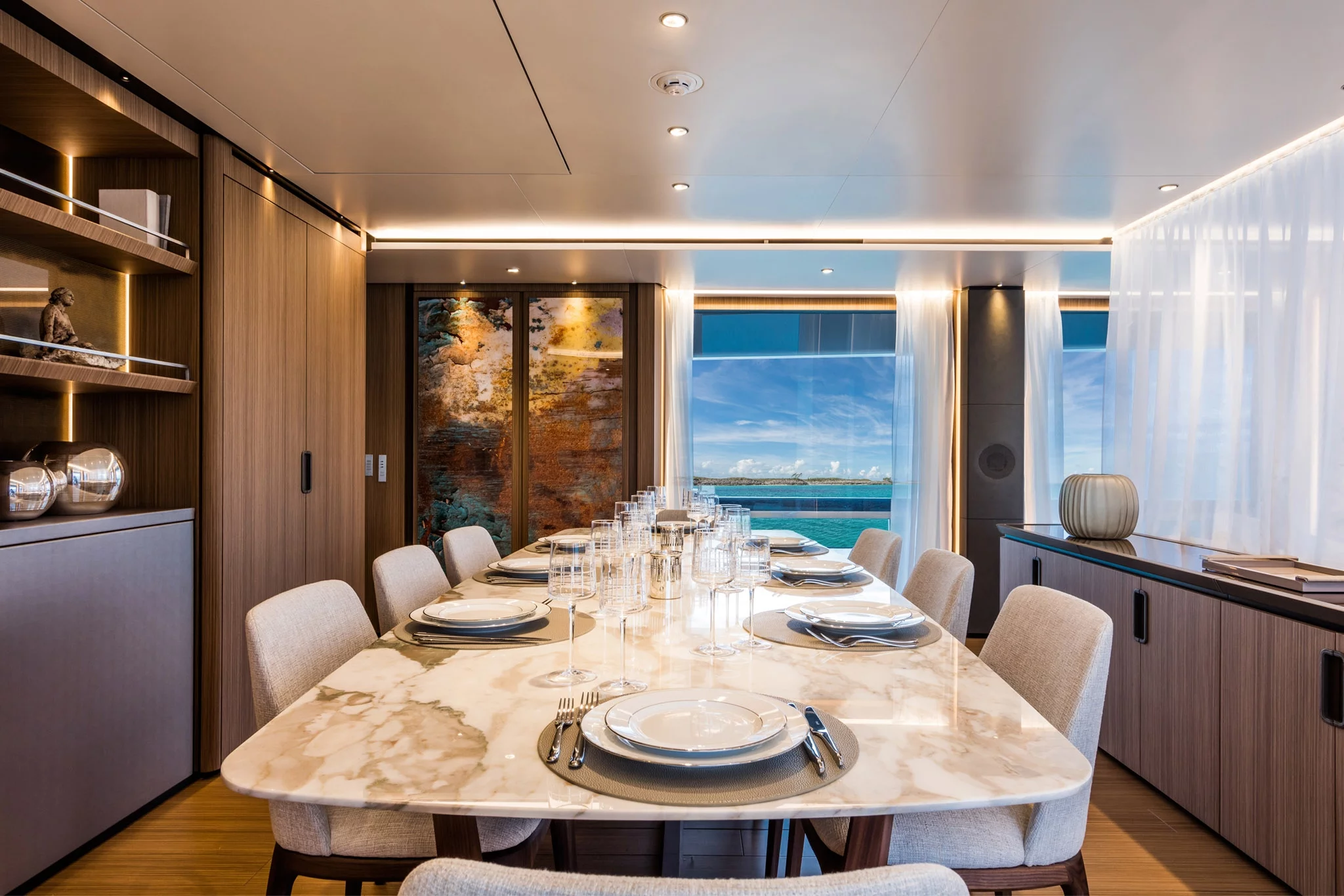 This fusion of cutting-edge materials and refined aesthetics makes the yacht a benchmark for exclusivity and performance in the luxury nautical market.