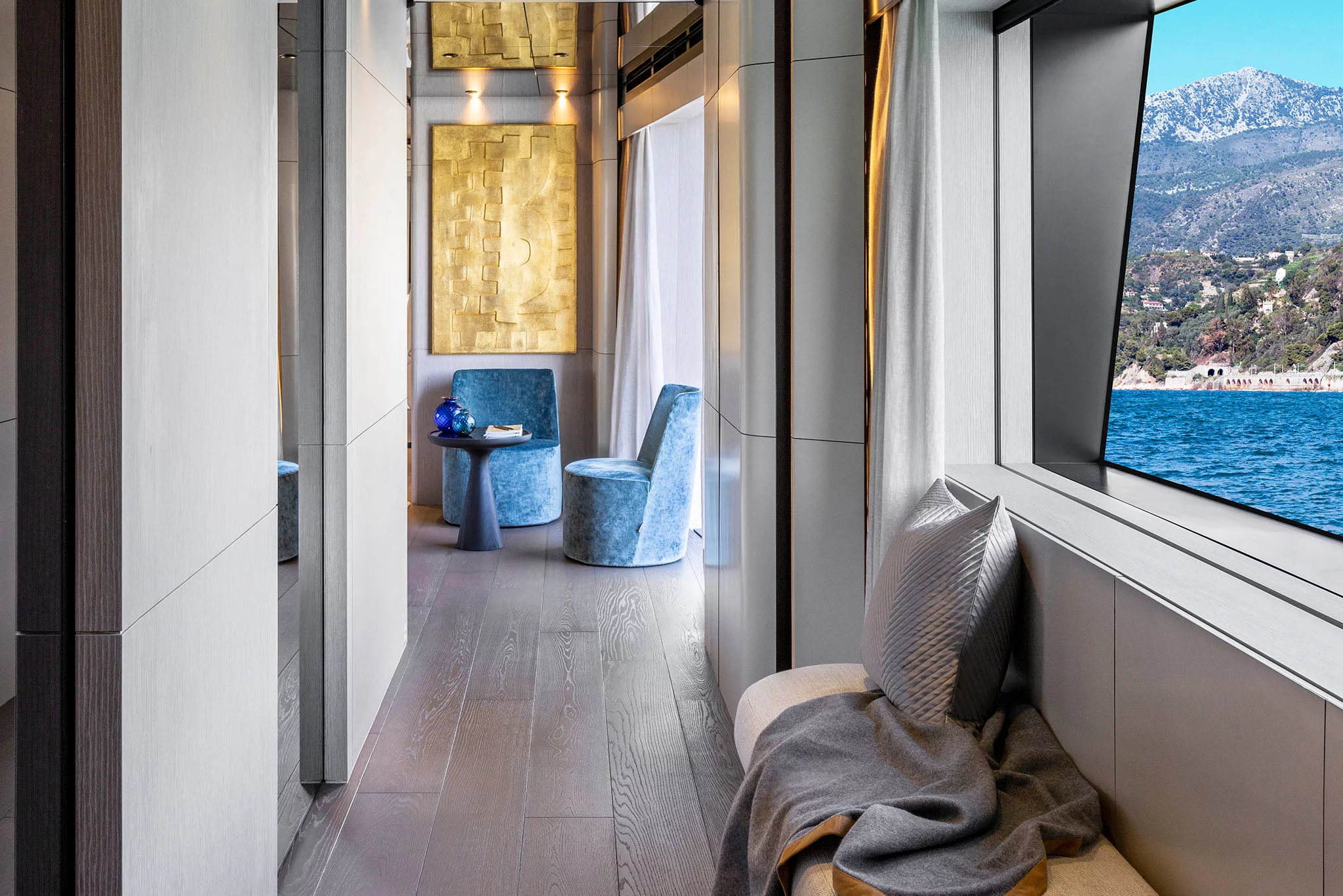 The exterior and interior design are by Francesco Paszkowski, in collaboration with Margherita Casprini and the Custom Line Atelier, resulting in sleek lines stretching from bow to stern, creating an exciting interplay of materials and colors between dark glass surfaces and light structural elements.