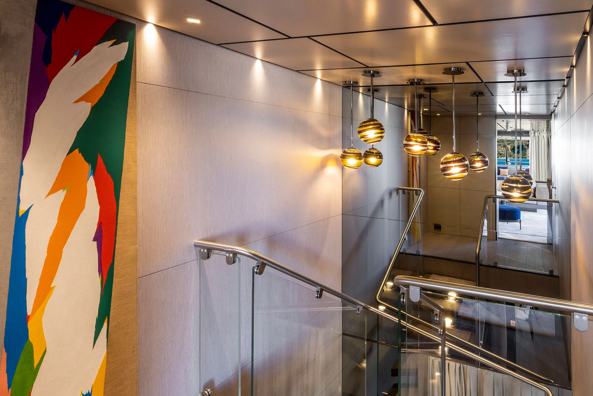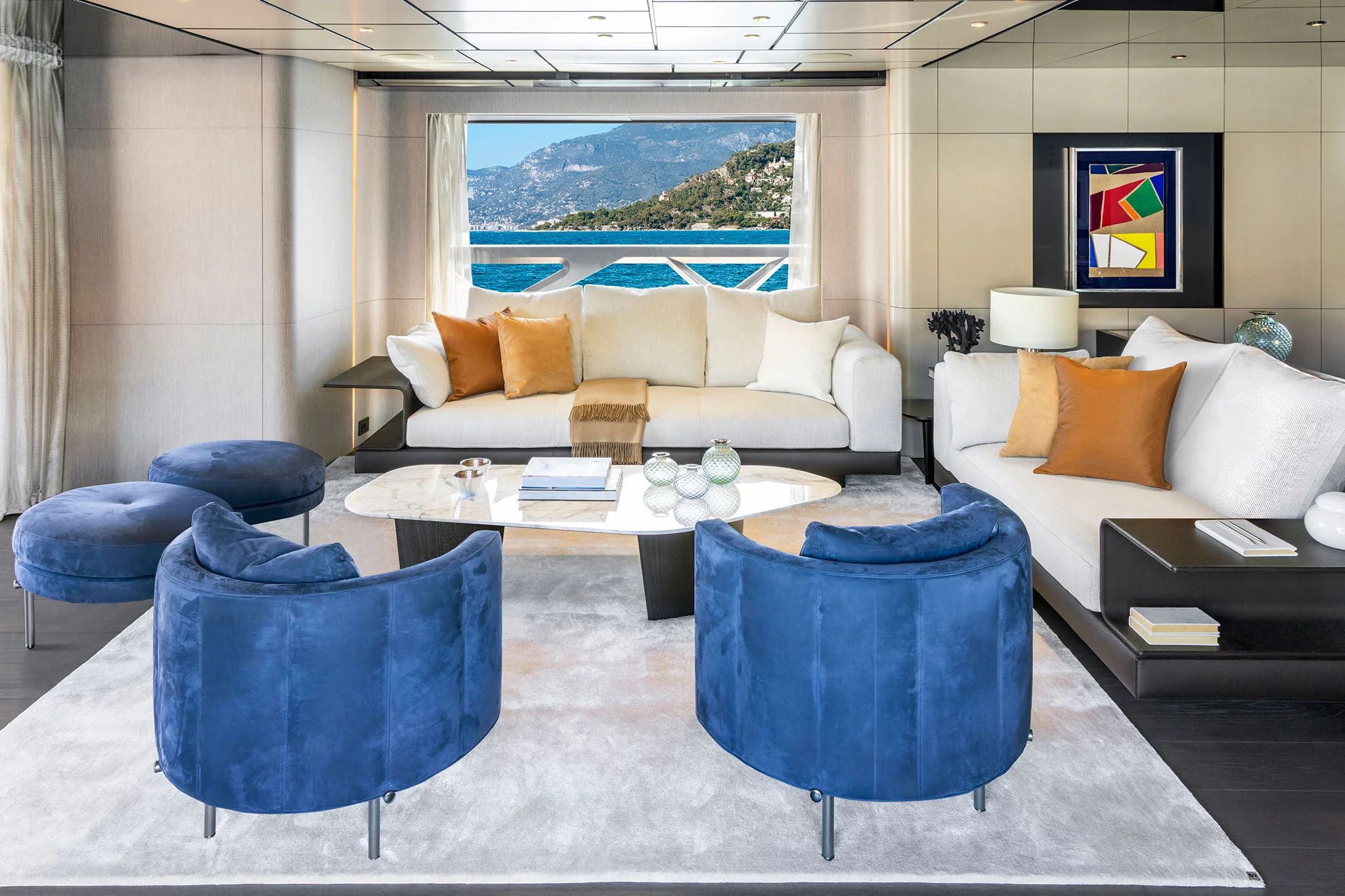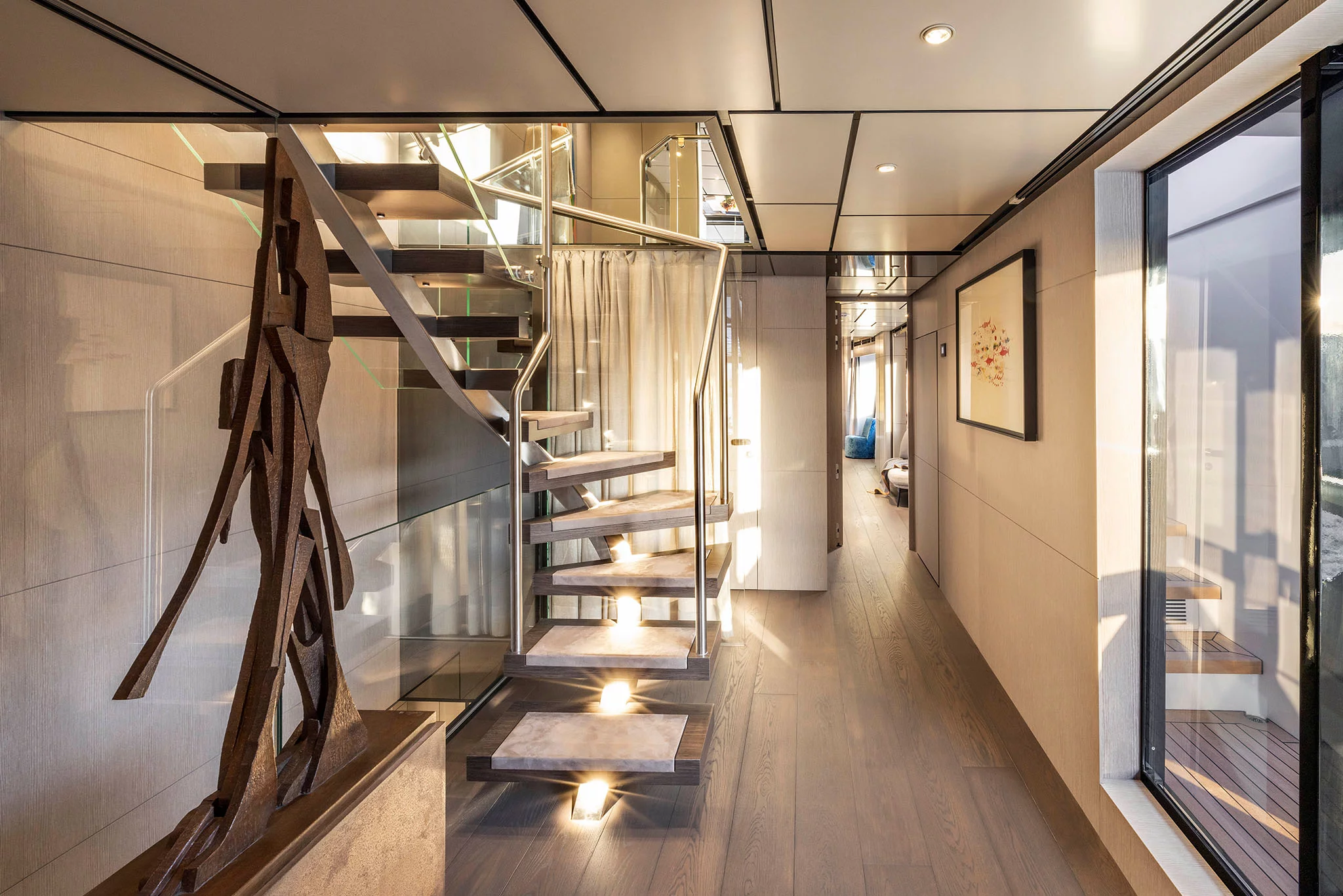 The yacht offers over 300 square meters of interior space and 200 square meters of exterior areas, spread across four decks. The layout includes a 44-square-meter owner's suite on the main deck, featuring a double walk-in wardrobe and a full bathroom, as well as four additional cabins on the lower deck, comfortably accommodating up to 10 guests.