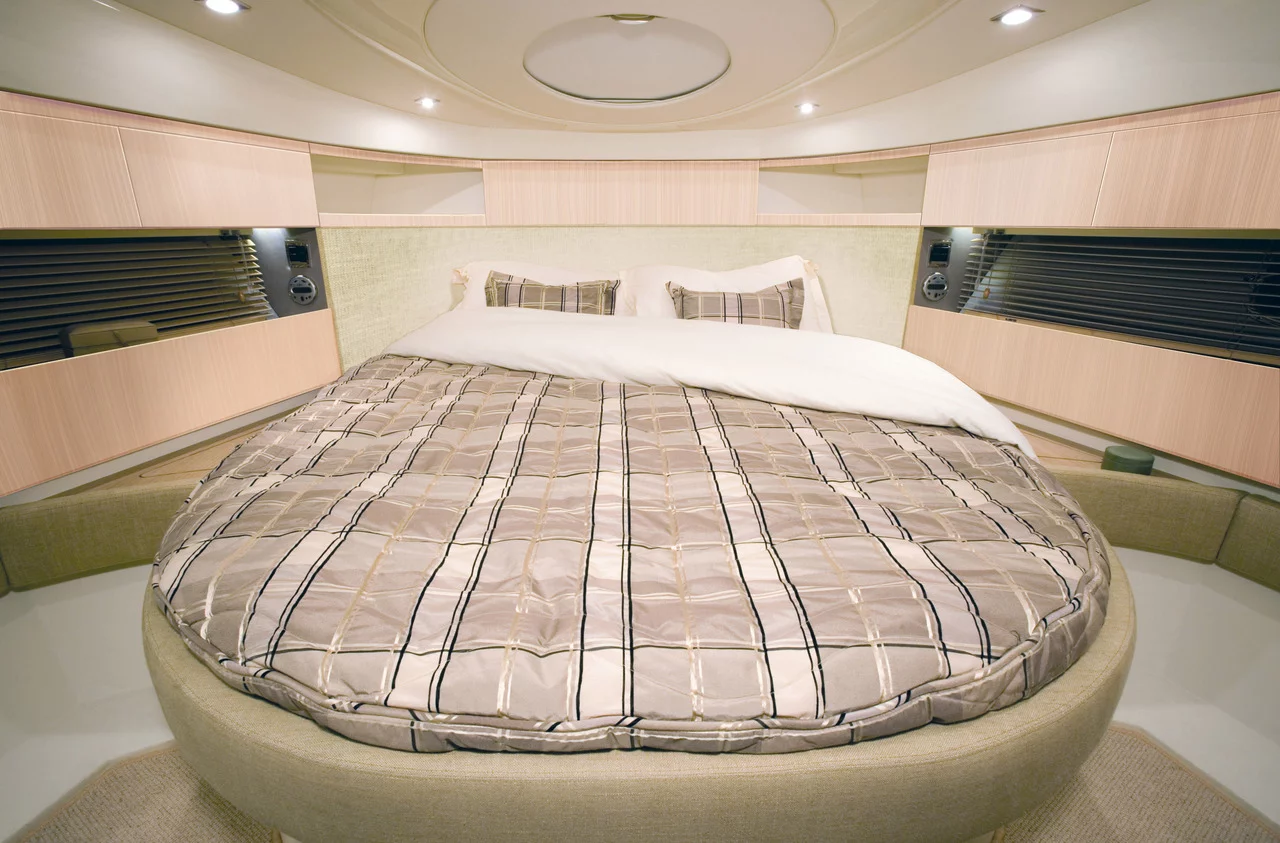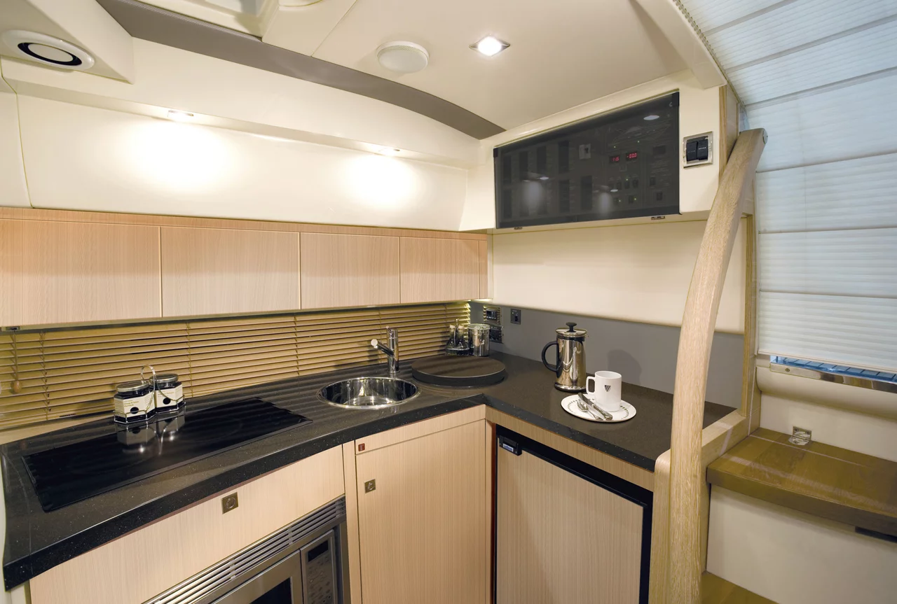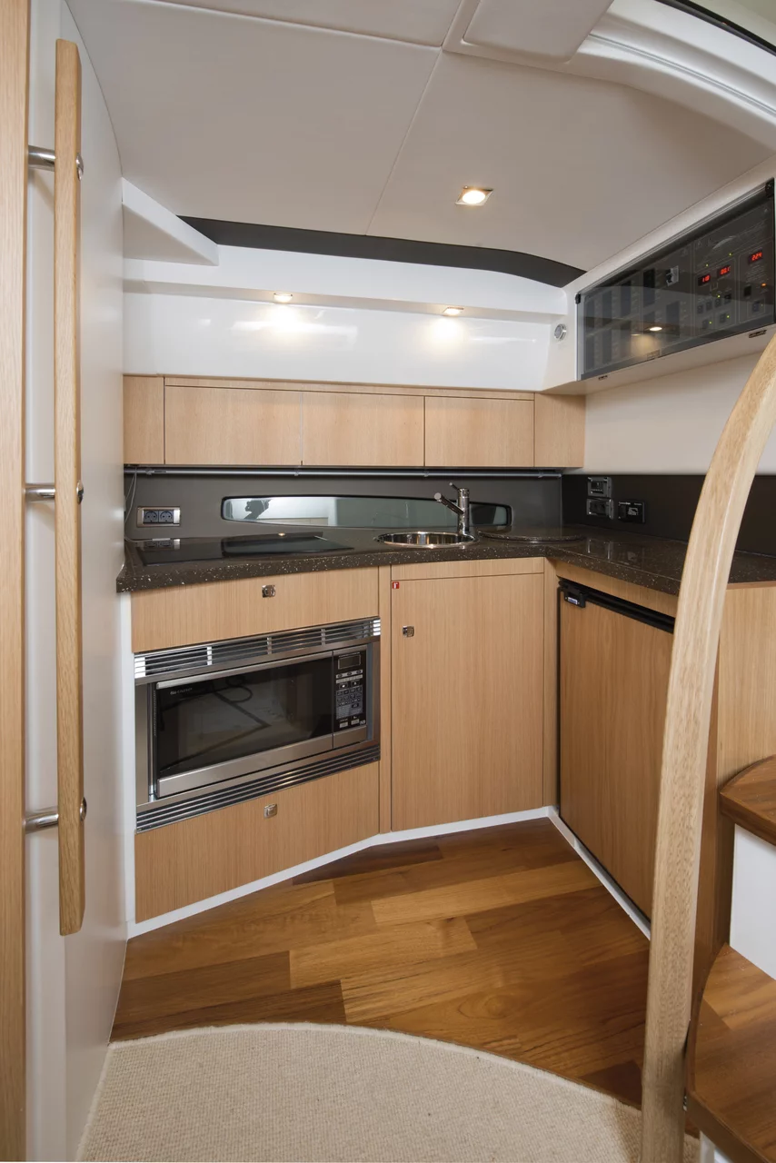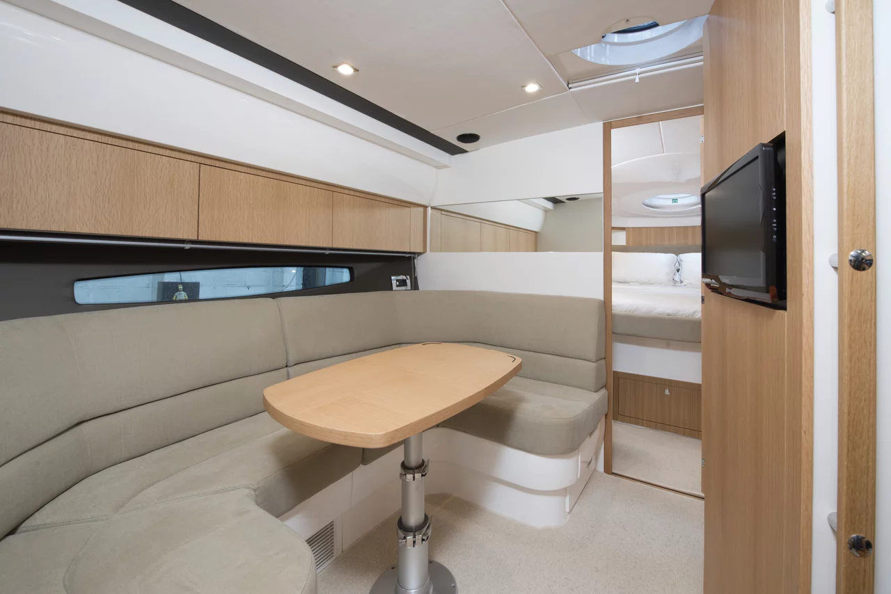 There’s ample accommodation for a large group of day-trippers and it sleeps up to 7 with ease. Below, the large forward cabin enjoys natural light from the twin portholes and deck hatch and the guest cabin defies the norm with generous headspace above its twin berths. Seemingly impossible on a boat this size, an optional sofa bed converts into a third berth.