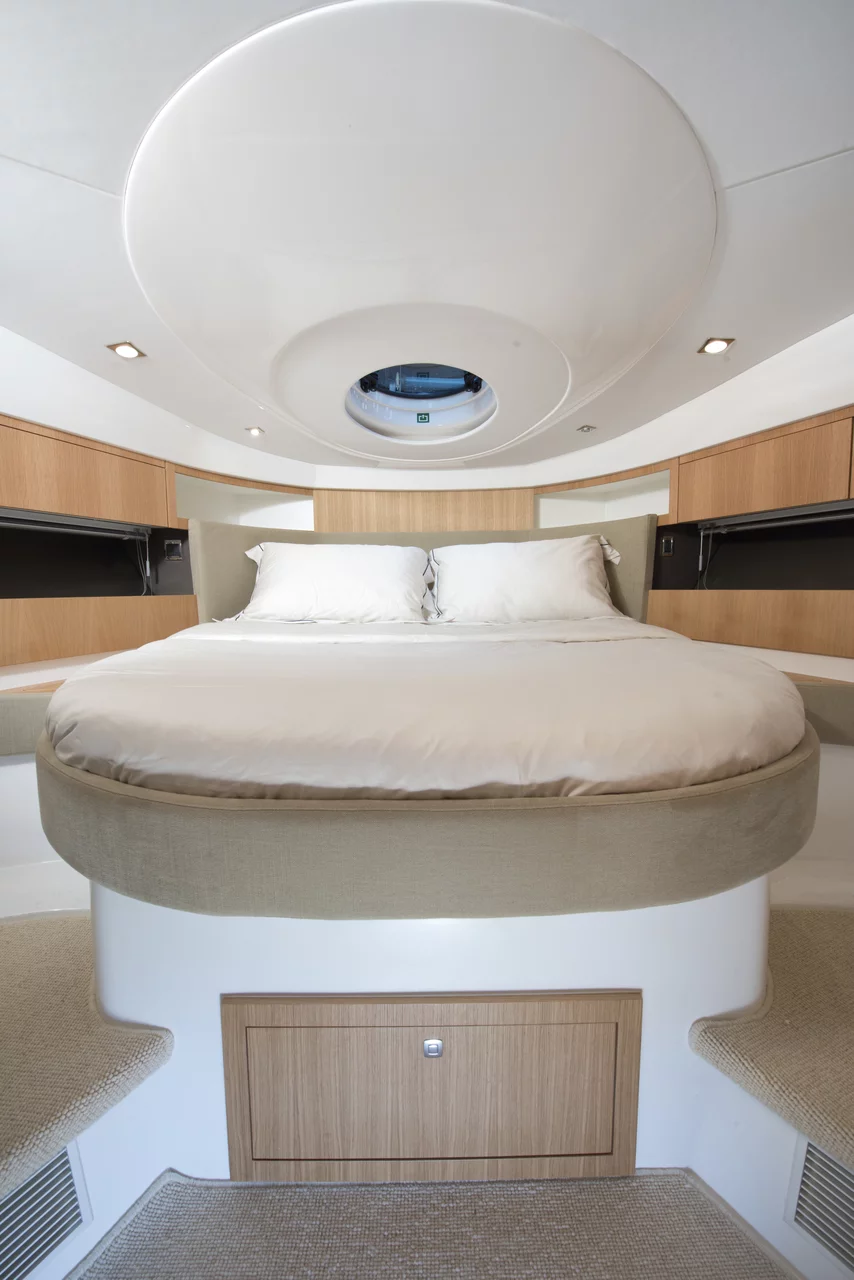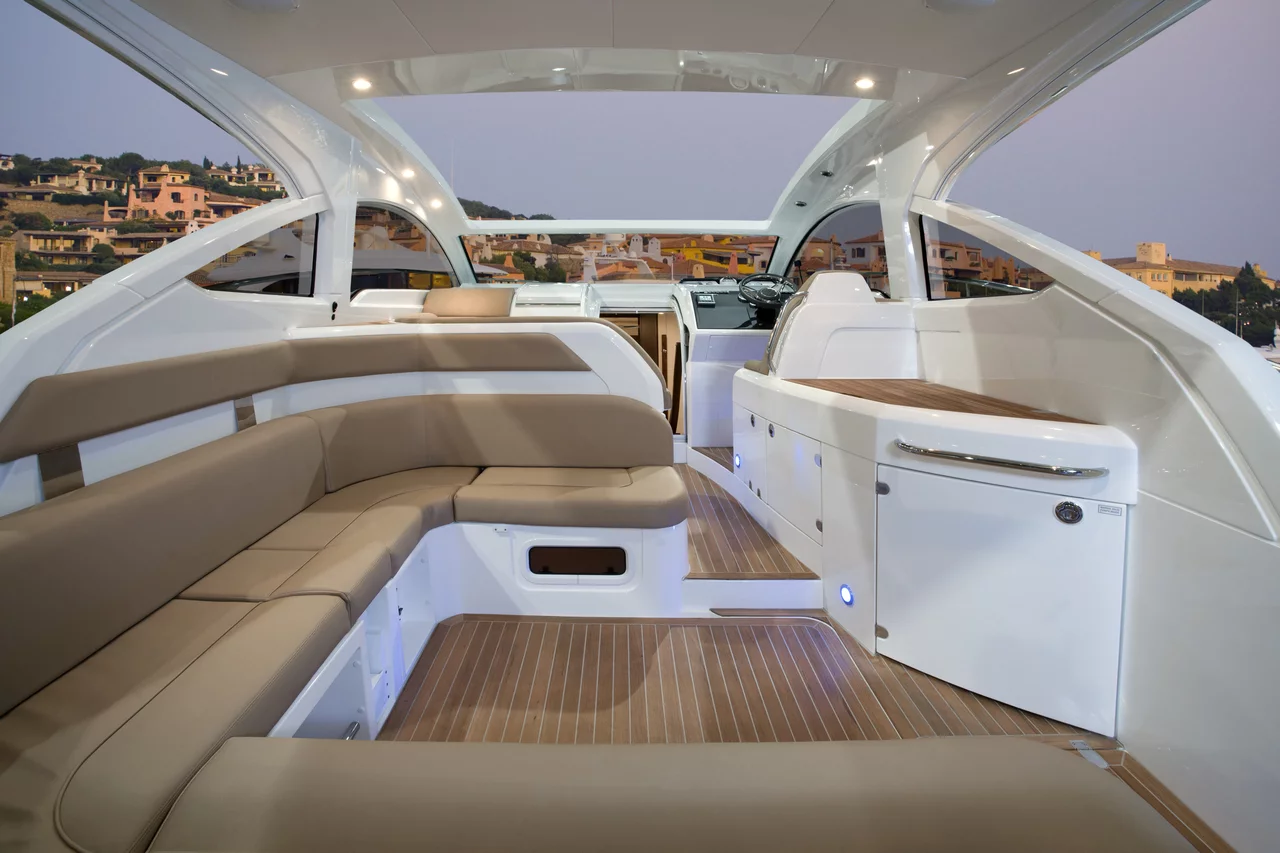 Demand for a hard top version was too great for us not to take it seriously. But we had to get it right. We worked with Makefast to acquire a tried and tested roof and electrical system. Reliable, easy to use and neat. The Targa 38OPEN offers the largest roof opening area for a boat of this size and a long overhang over the cockpit to offer maximum protection. We also extended the glazing to give greater all-round vision and further enhance the feeling of an express cruiser that’s open to the world around it. This big boat thinking also extends aft, where you can specify a submersible bathing platform for ultimate enjoyment of the water.