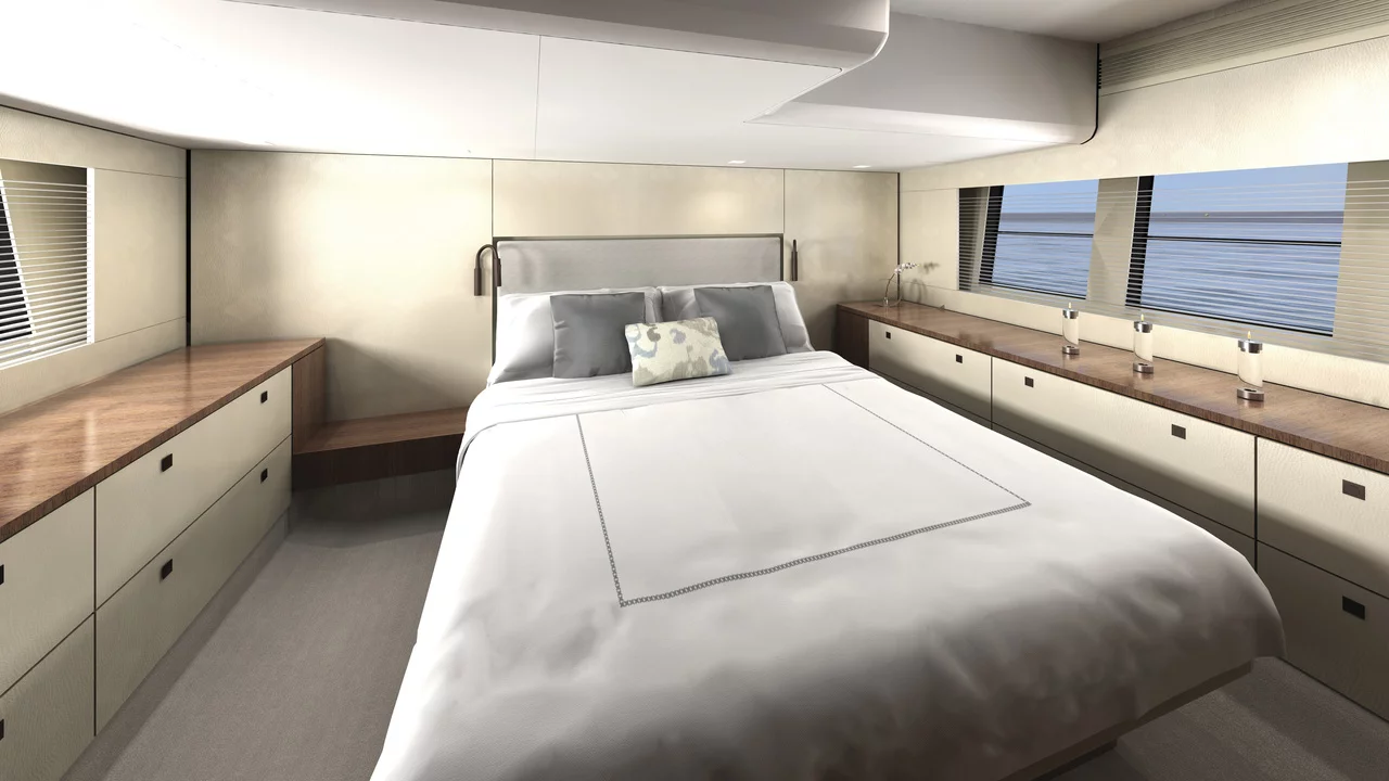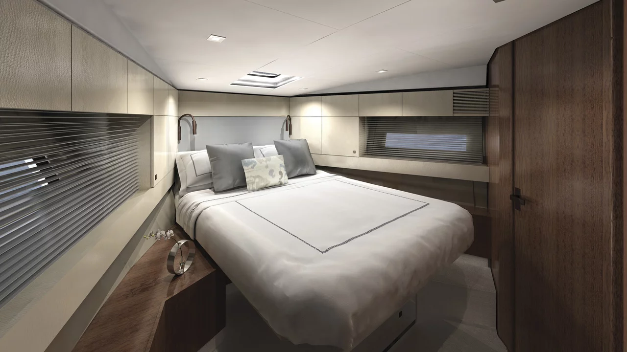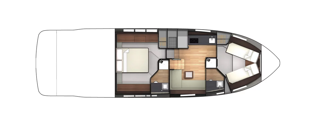 Moving through the boat you’ll find a luxuriously spacious, sociable upper deck that offers plentiful seating, in addition to a well-appointed helm station with twin seats. The cockpit features a J-shaped seating area with a table, and can offer the option of a sunbed conversion. The lower deck has three cabins as standard and there is an optional lower saloon/dinette in lieu of the third cabin layout. Perfectly formed, perfectly thought-through. Everything you come to expect from a Fairline.