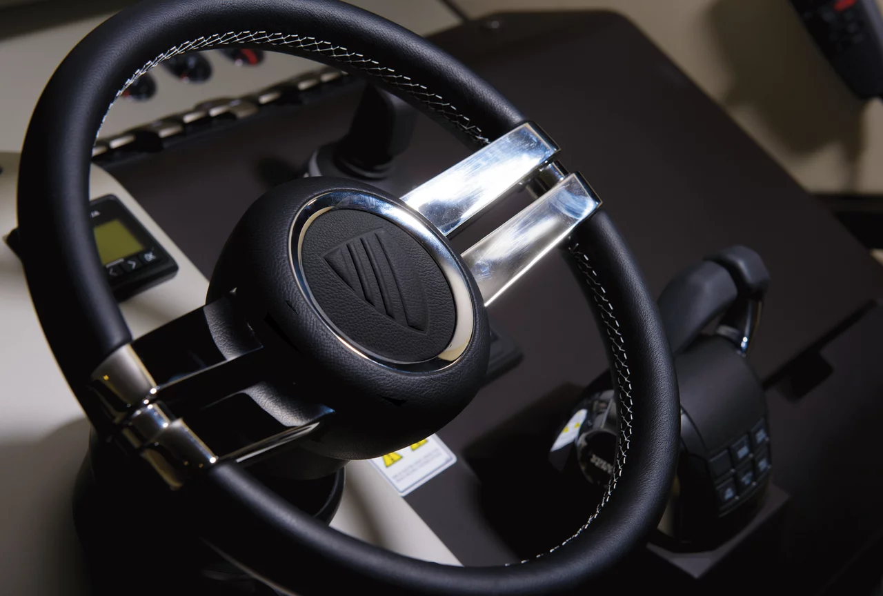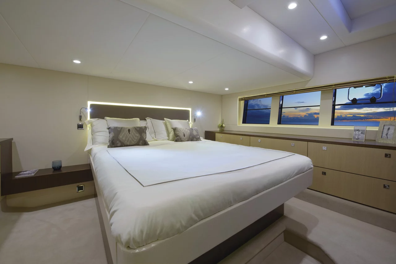 The expansive flybridge, for instance, creates a number of sociable scenarios; there’s a large seating area around a dining table that can be lowered to convert into a sunpad, as well as forward-facing seating alongside the upper helm - an exhilarating place to be whilst under way.