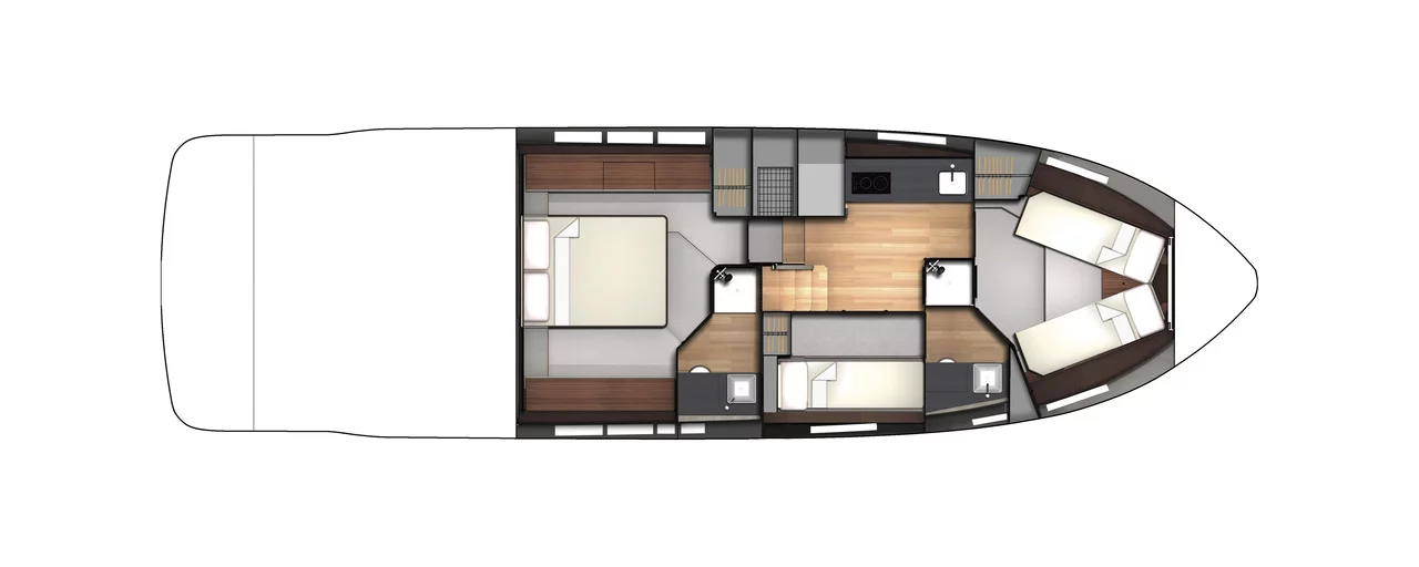The submersible bathing platform offers a delightful way to enjoy the water and can also accommodate a jet tender. Move through to the large welcoming saloon and you will find relaxed seating areas to both port and starboard and sociable considerations like the forward-facing companionway seating alongside the helm. The naturally illuminated galley is carefully considered and perfectly specified. Below, the three cabins reflect the Squadron’s unmistakably high standards; with the flexibility of a dinette option in place of the third cabin.