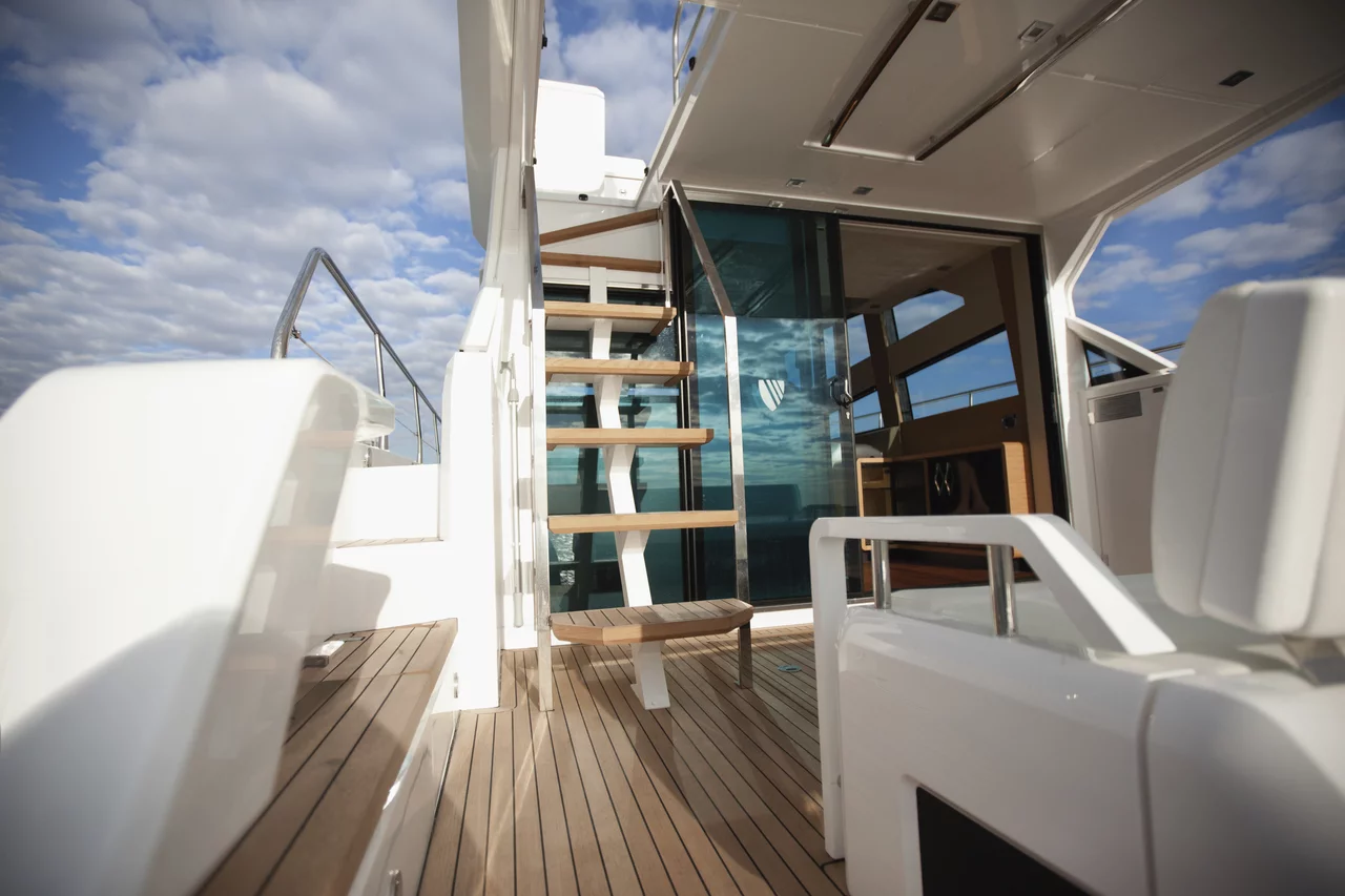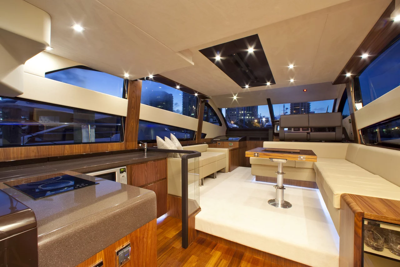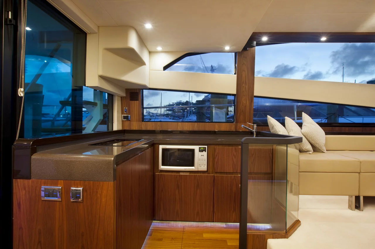 In terms of both equipment and styling, the huge, airy saloon is an example of interior design at its very best and here we feature enormous panoramic windows. The aft positioned galley places you right at the heart of the action and helps deliver the perfect, sociable alfresco environment.