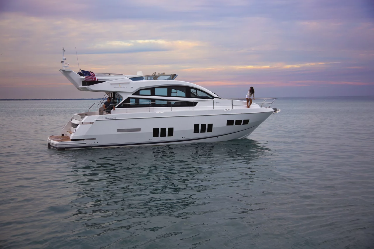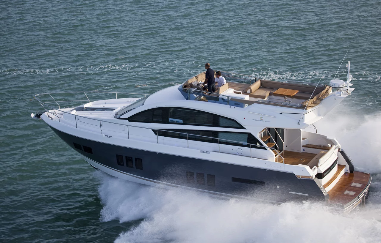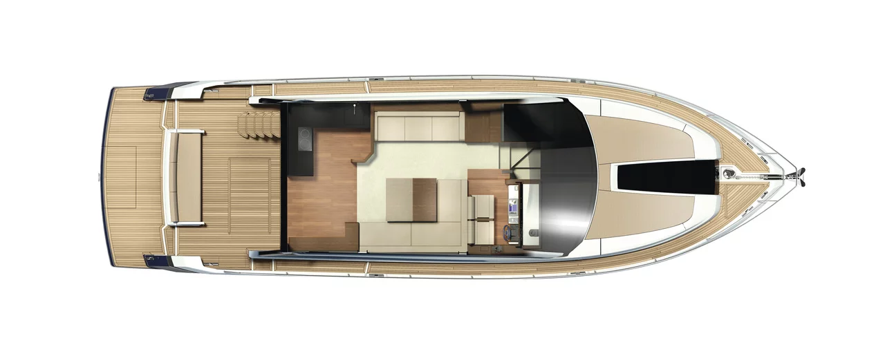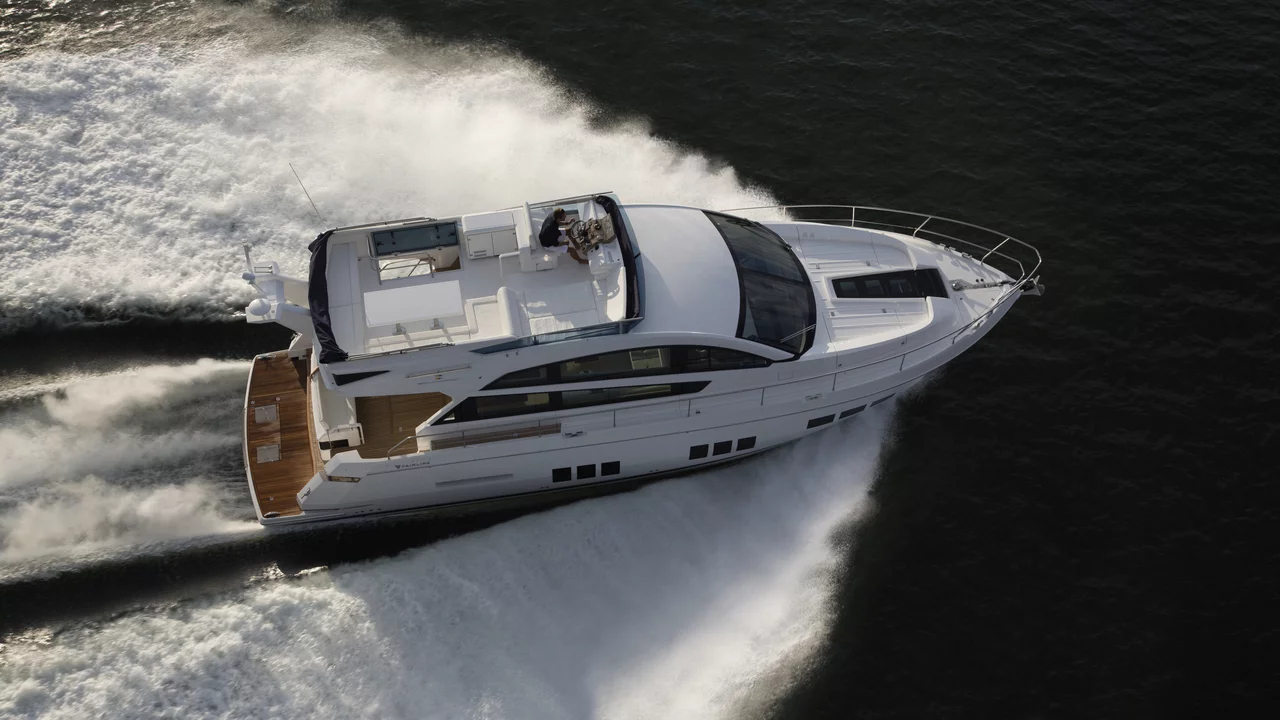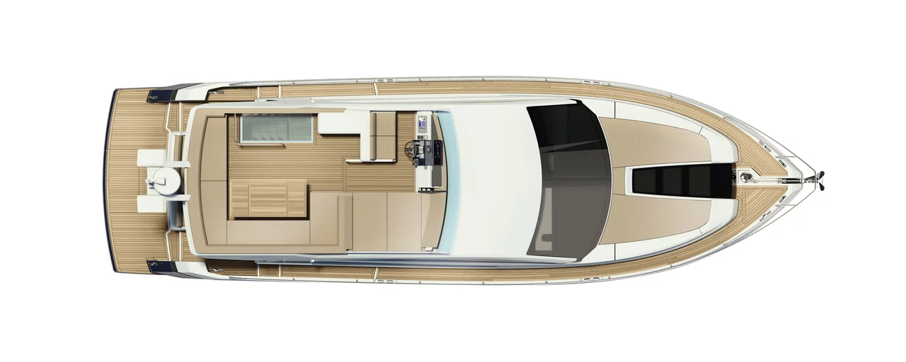 The flybridge is larger than previously seen on a boat of this size, providing plentiful areas for entertaining and relaxing. Aft, the ‘frameless’ glass entrance door - with its own opening window - allows seamless access to the extensive cockpit. Fairline's Tender Launch System helps watercraft up to the size and weight of a Williams 285 Jet RIB effortlessly in and out of the water.