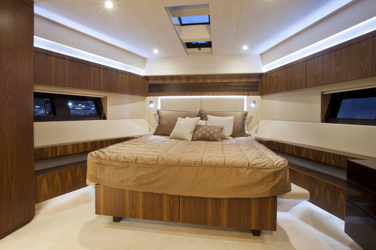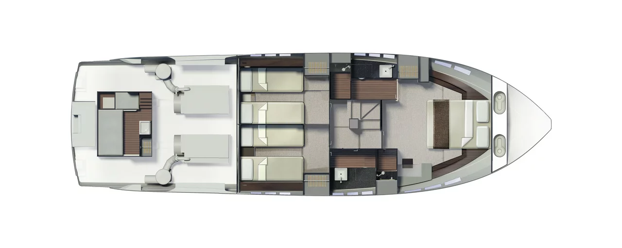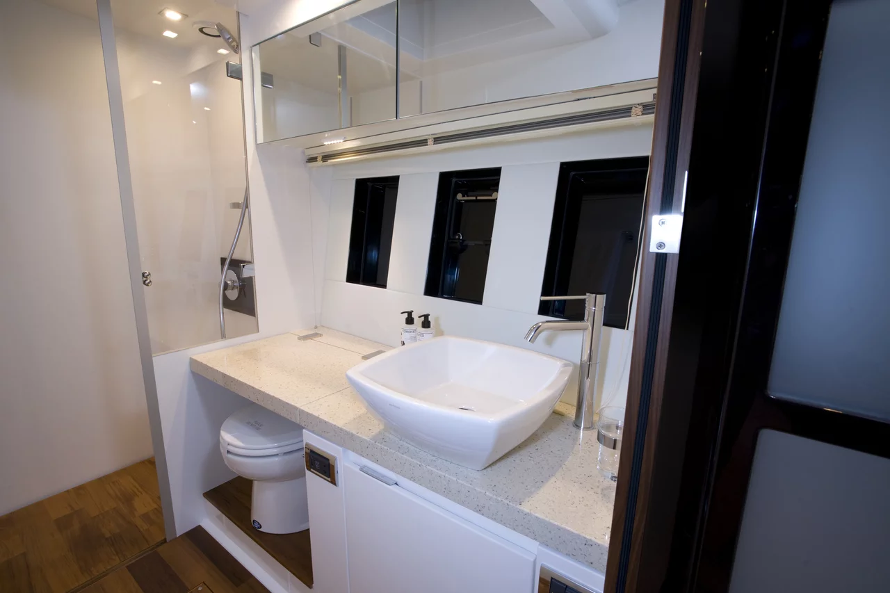 The spectacular, light-filled master cabin with its panoramic hull windows, overhead glazed panels and 6'6" flat headroom, boasts dimensions that would shame many 60ft boats. You’ll also find two beautifully appointed guest cabins, as well as two large en suite bathrooms. An optional fourth cabin with feature window can be easily accessed from the cockpit.
