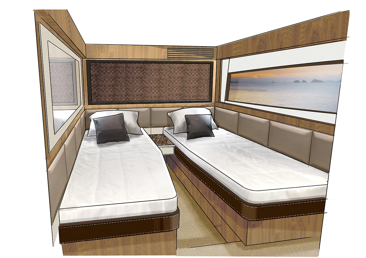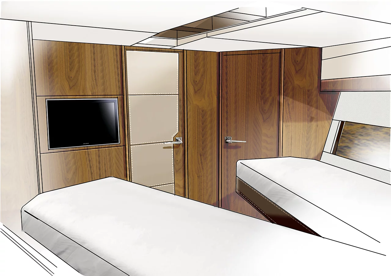 Our mid-ships master cabin is complemented by a double guest cabin forward and a versatile twin cabin to port. The cockpit and saloon accommodation has also been well thought through offering “J” shaped cockpit seating.