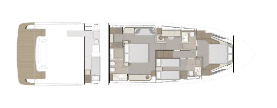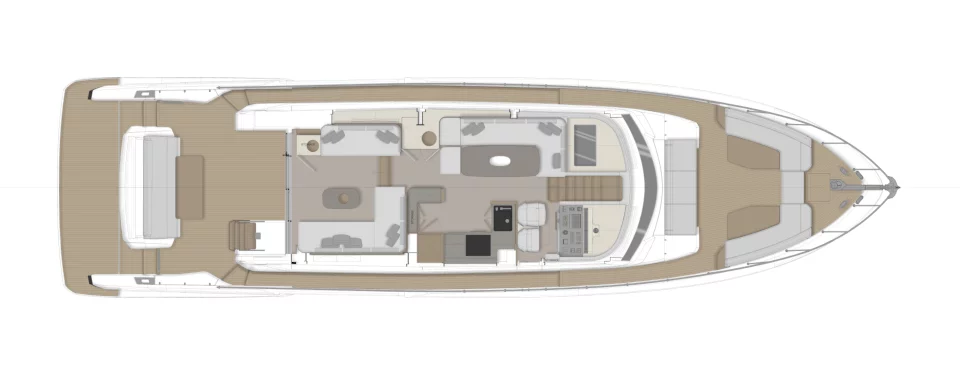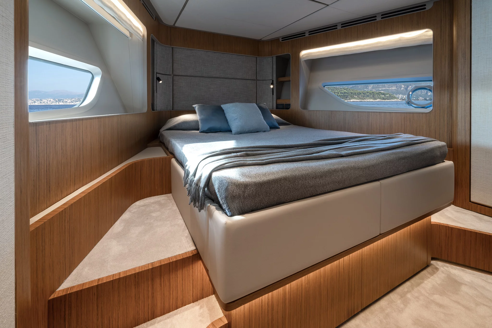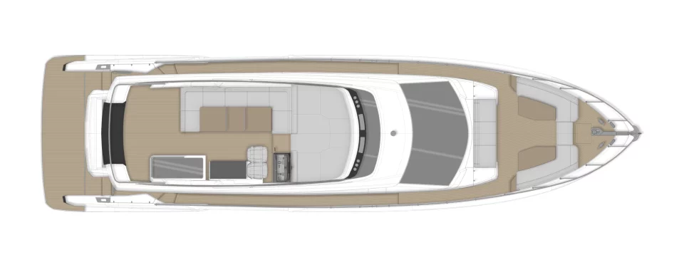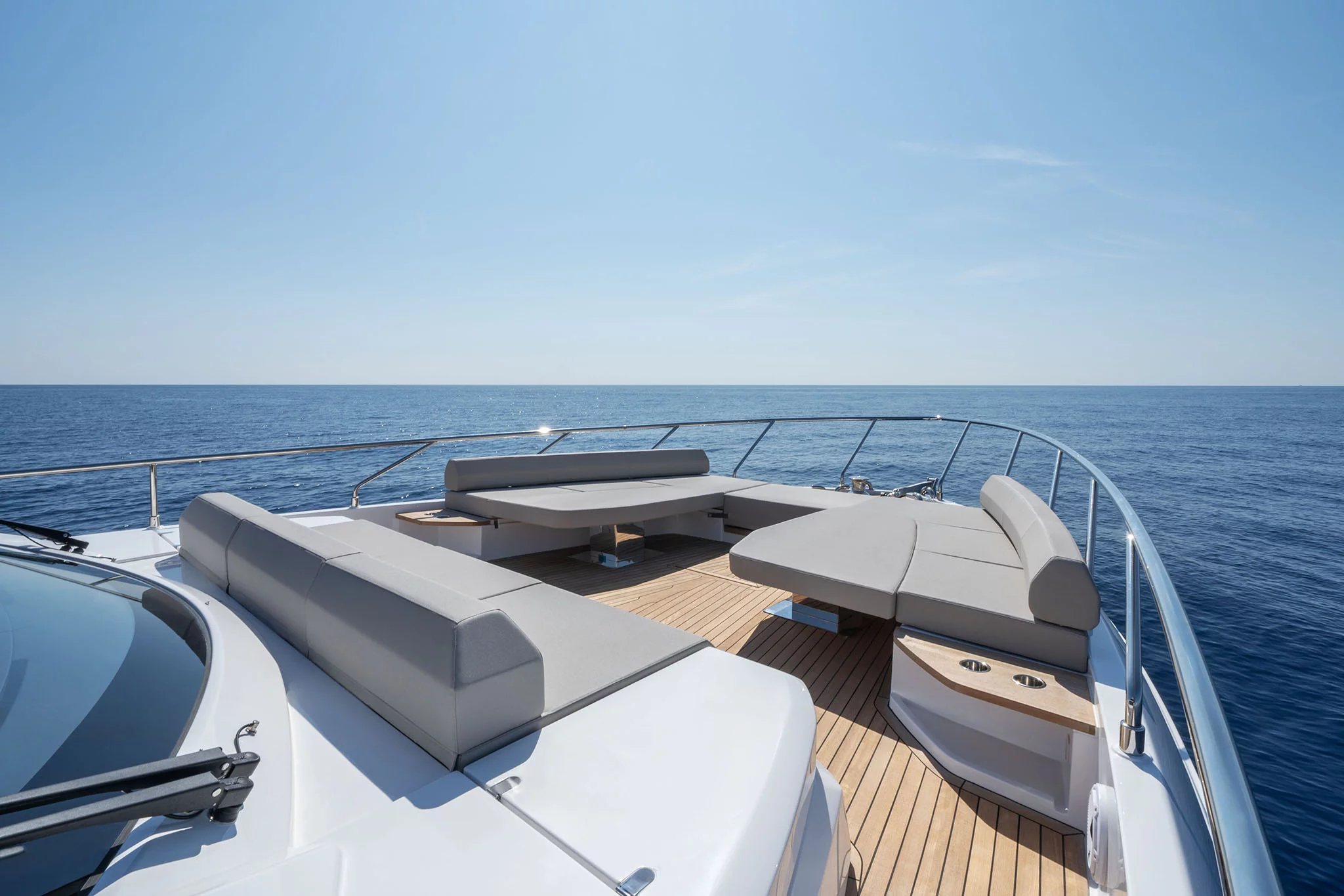 The customisable flybridge offers a prime area for outdoor relaxation and socialising, while the bow is equipped with luxurious lounging spaces.