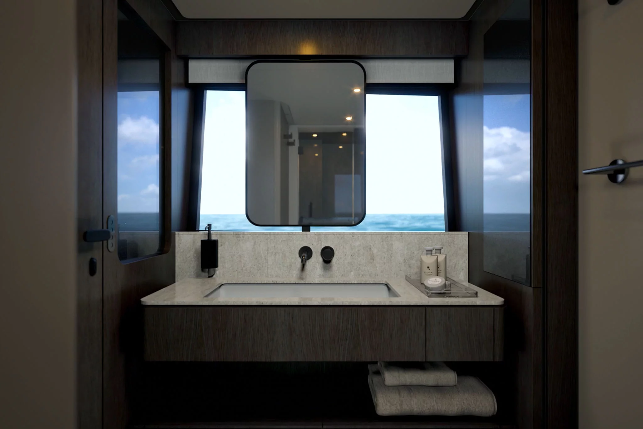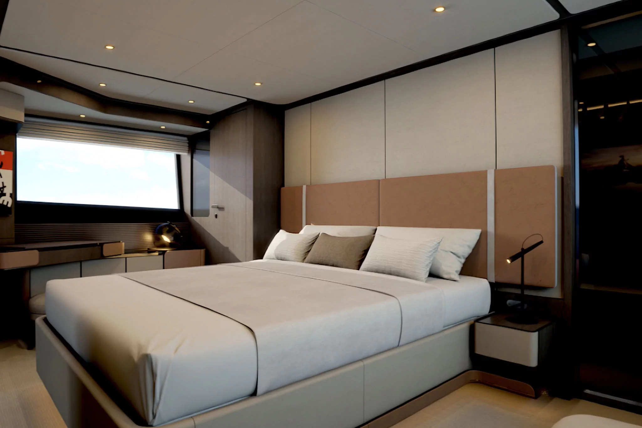 The main deck offers a spacious beach area and a generous cockpit with unobstructed sea views, while the lower deck includes four cabins — a master, a VIP and two guest cabins — each with en suite bathrooms.