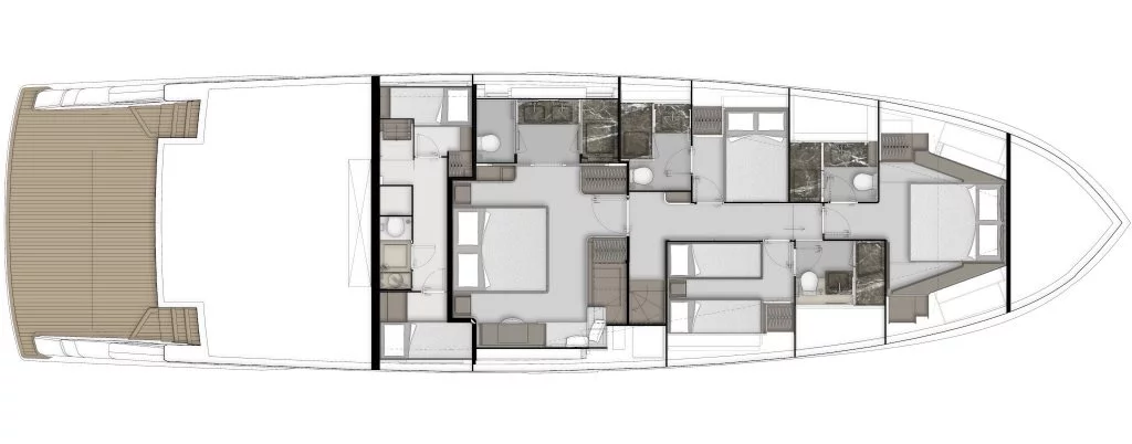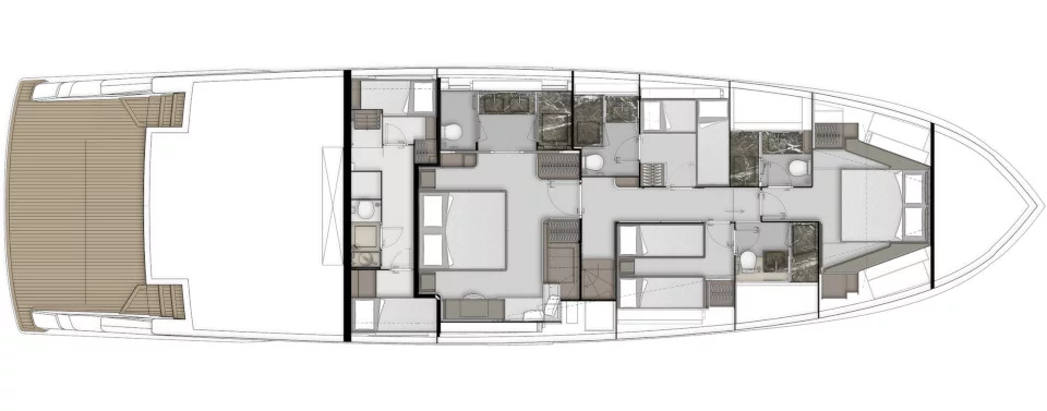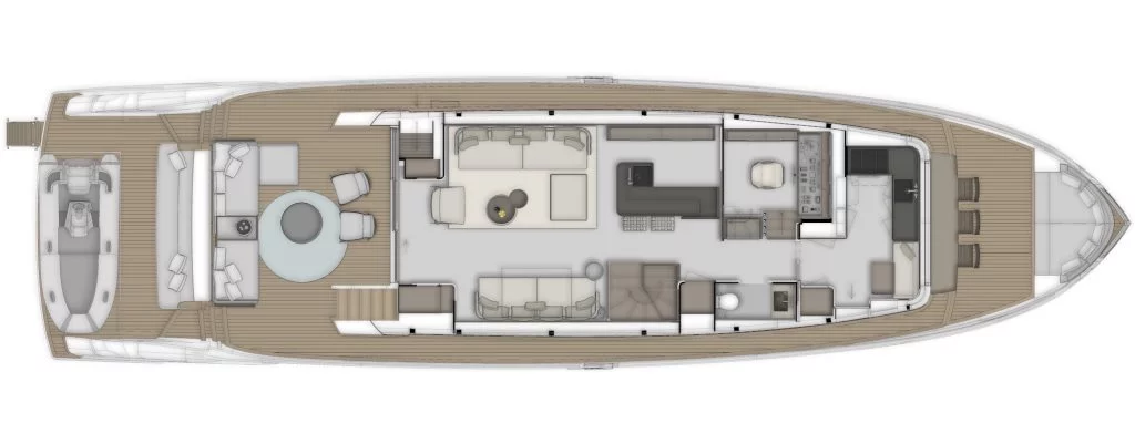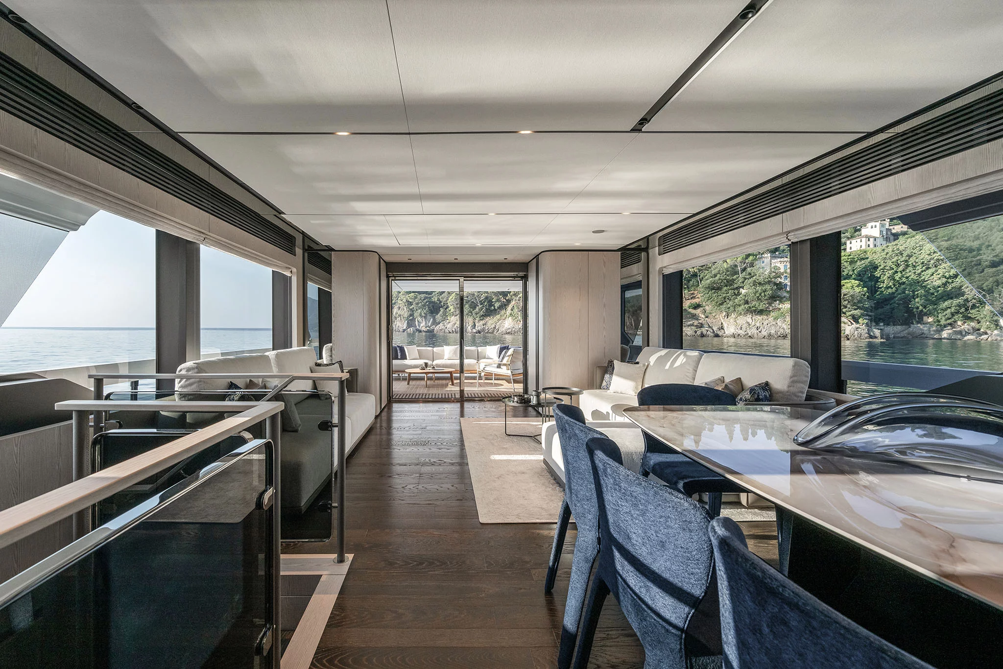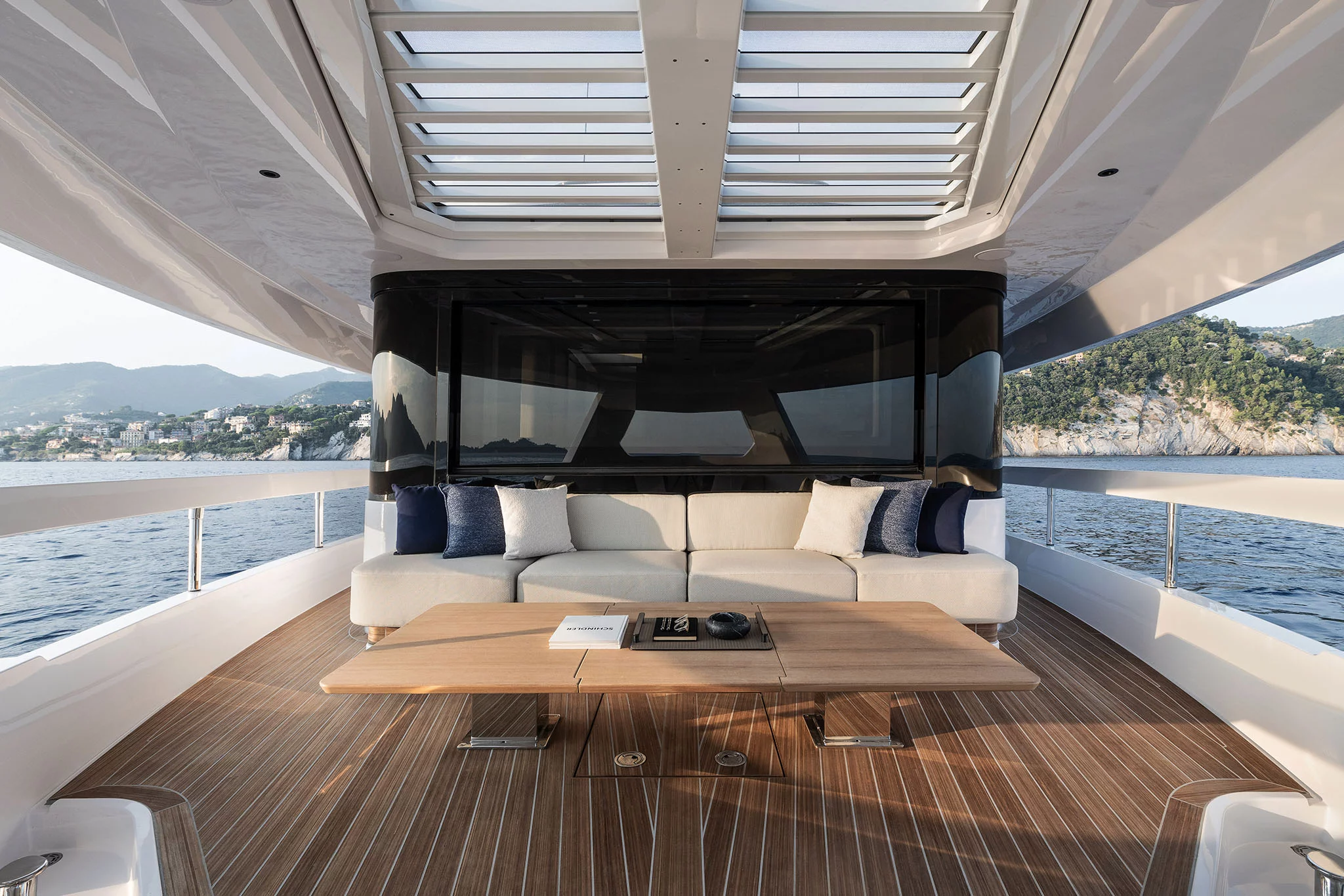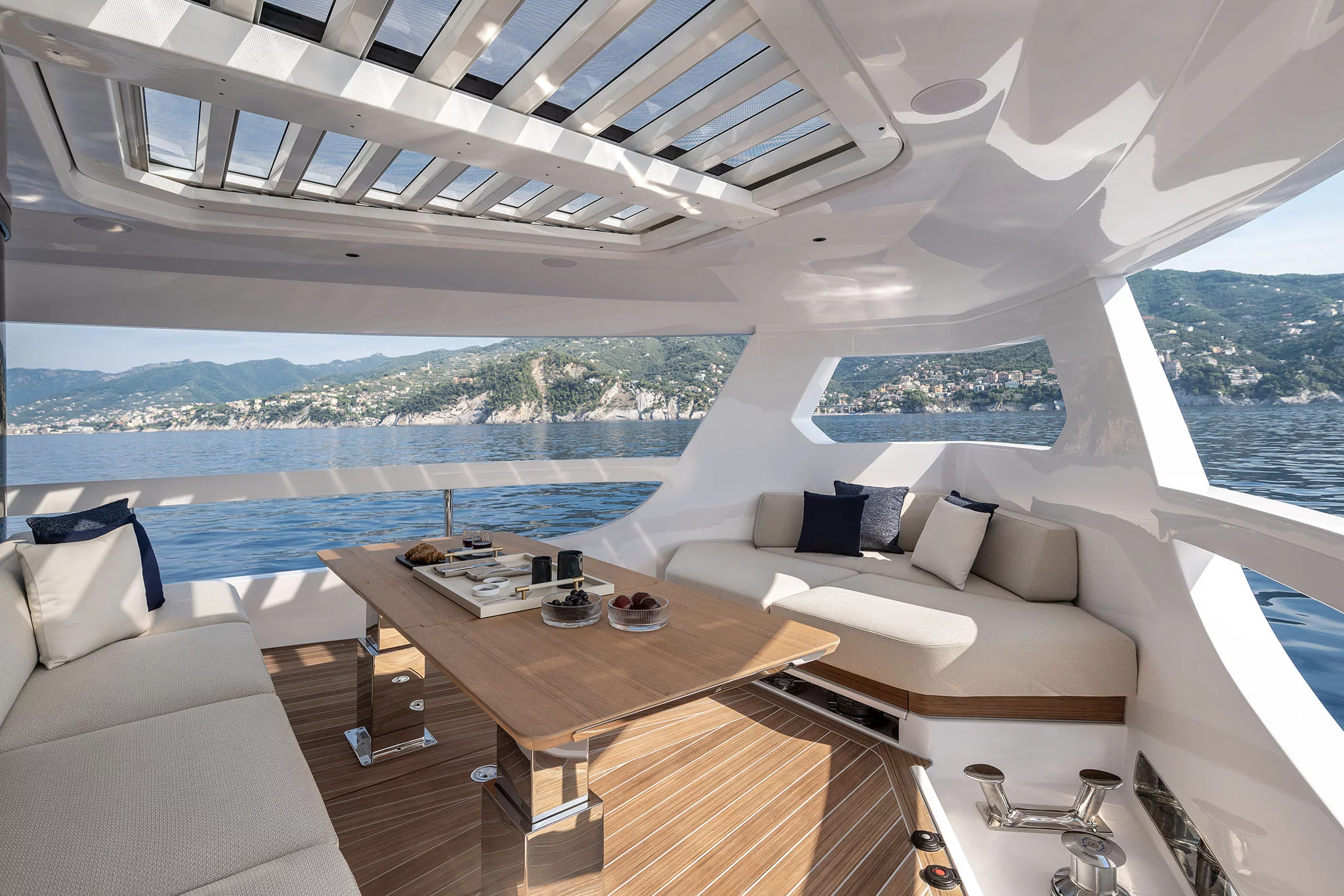 The exterior design stands out with its "All-Season Terrace," a covered bow area that offers protection in all weather conditions, allowing for a direct connection to the sea.