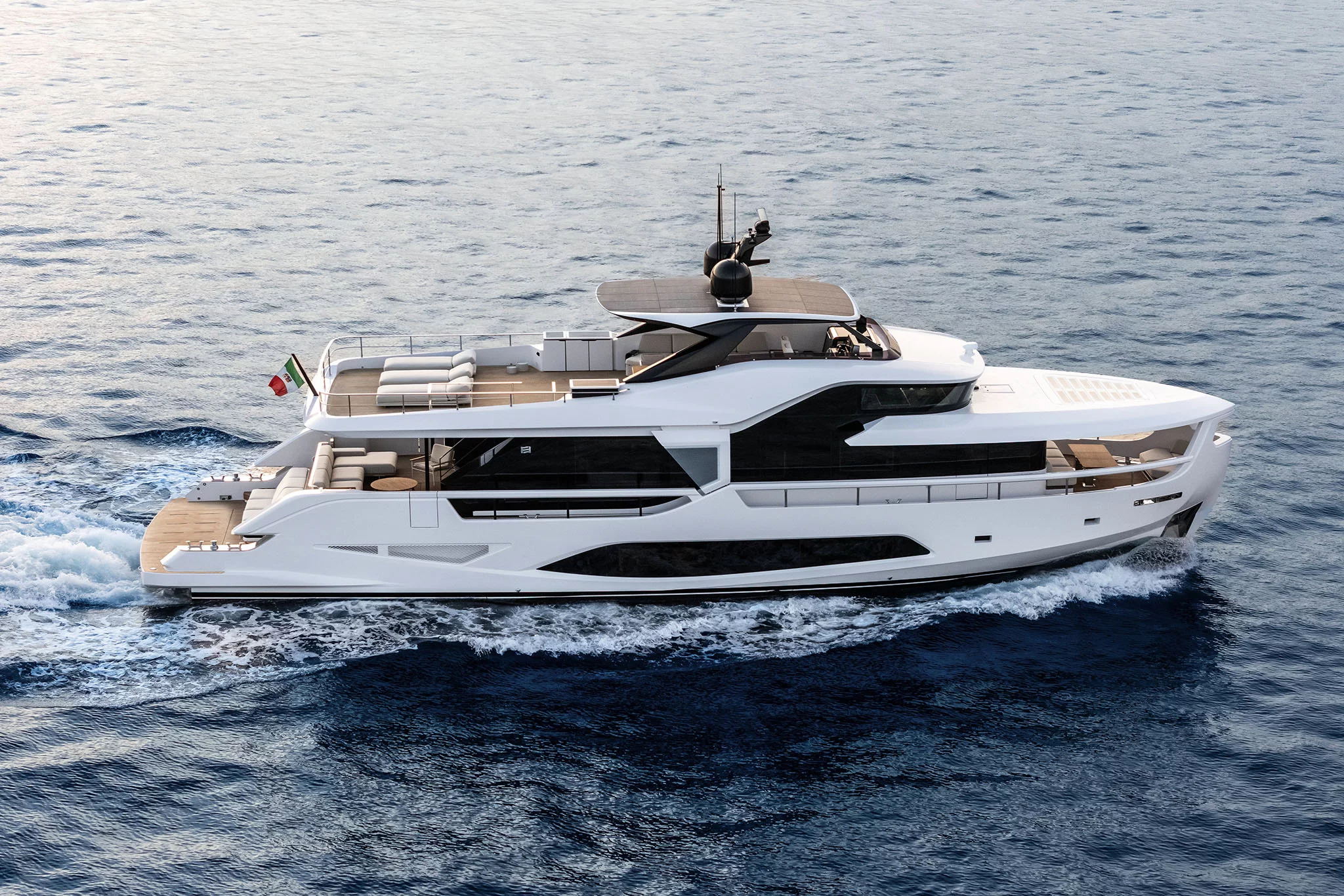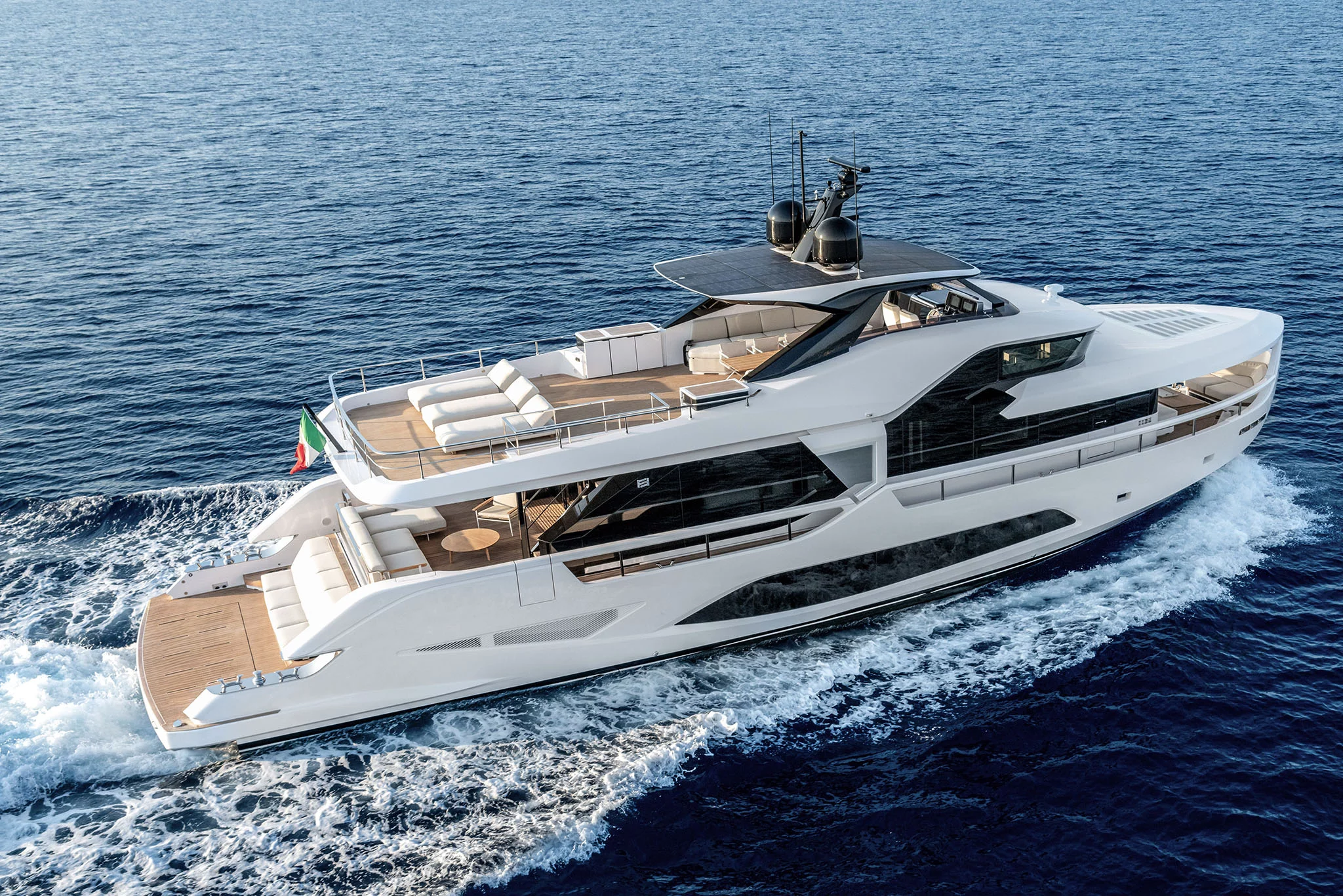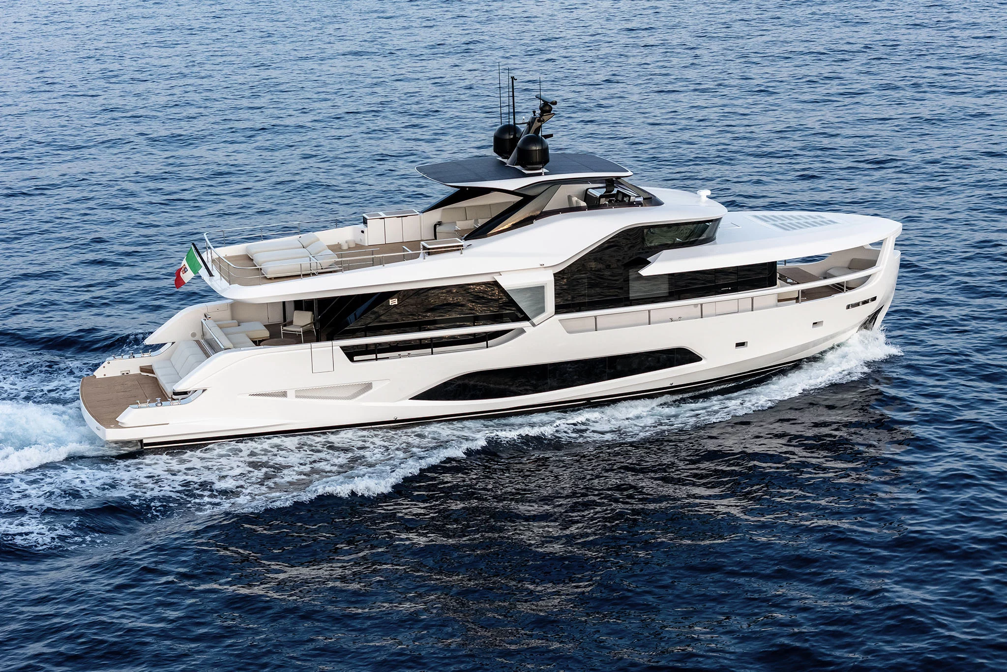 The INFYNITO 80 features F.S.E.A. (Ferretti Sustainable Enhanced Architecture) technology, including solar panels on the hardtop that power lithium batteries, enabling up to 8 hours of zero-emission and noise-free operation.