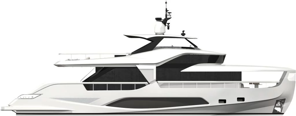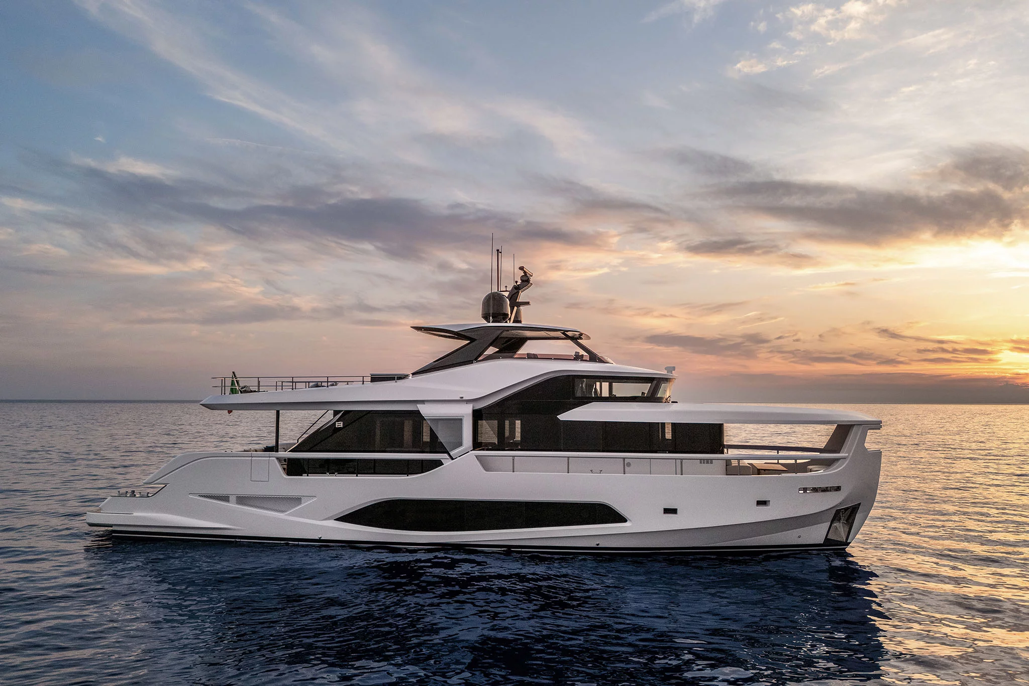 The Ferretti Yachts INFYNITO 80 is a luxury yacht measuring 23.7 metres in length with a beam of 6.32 metres, designed to provide a sustainable and comfortable cruising experience in all seasons. Equipped with two MAN V8 engines of 1,200 hp, it reaches a top speed of 20 knots.