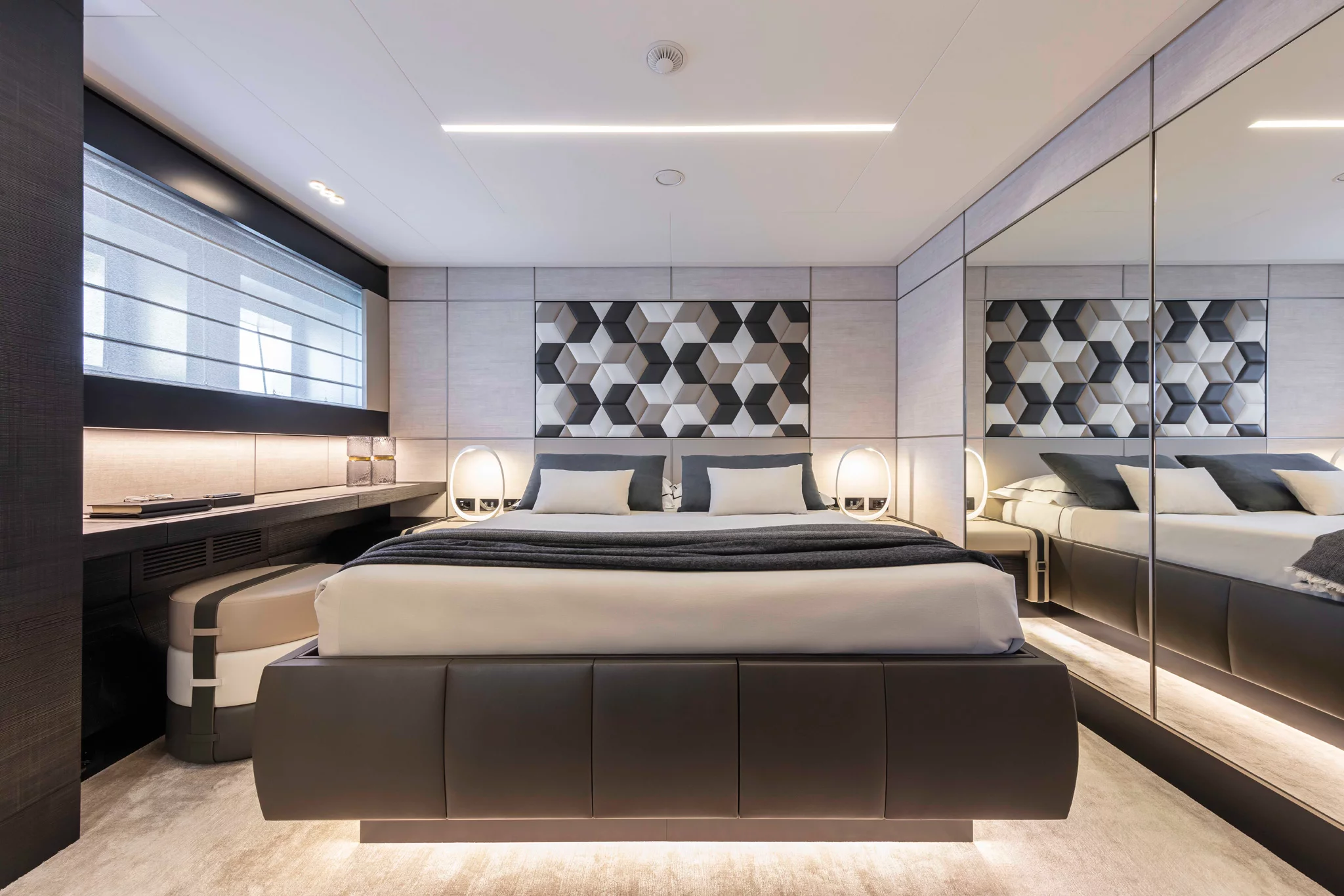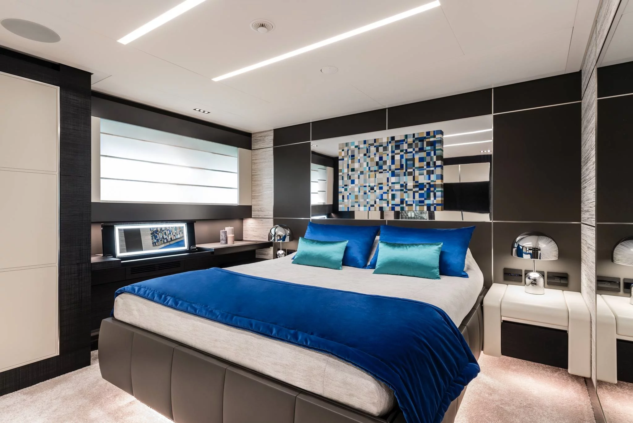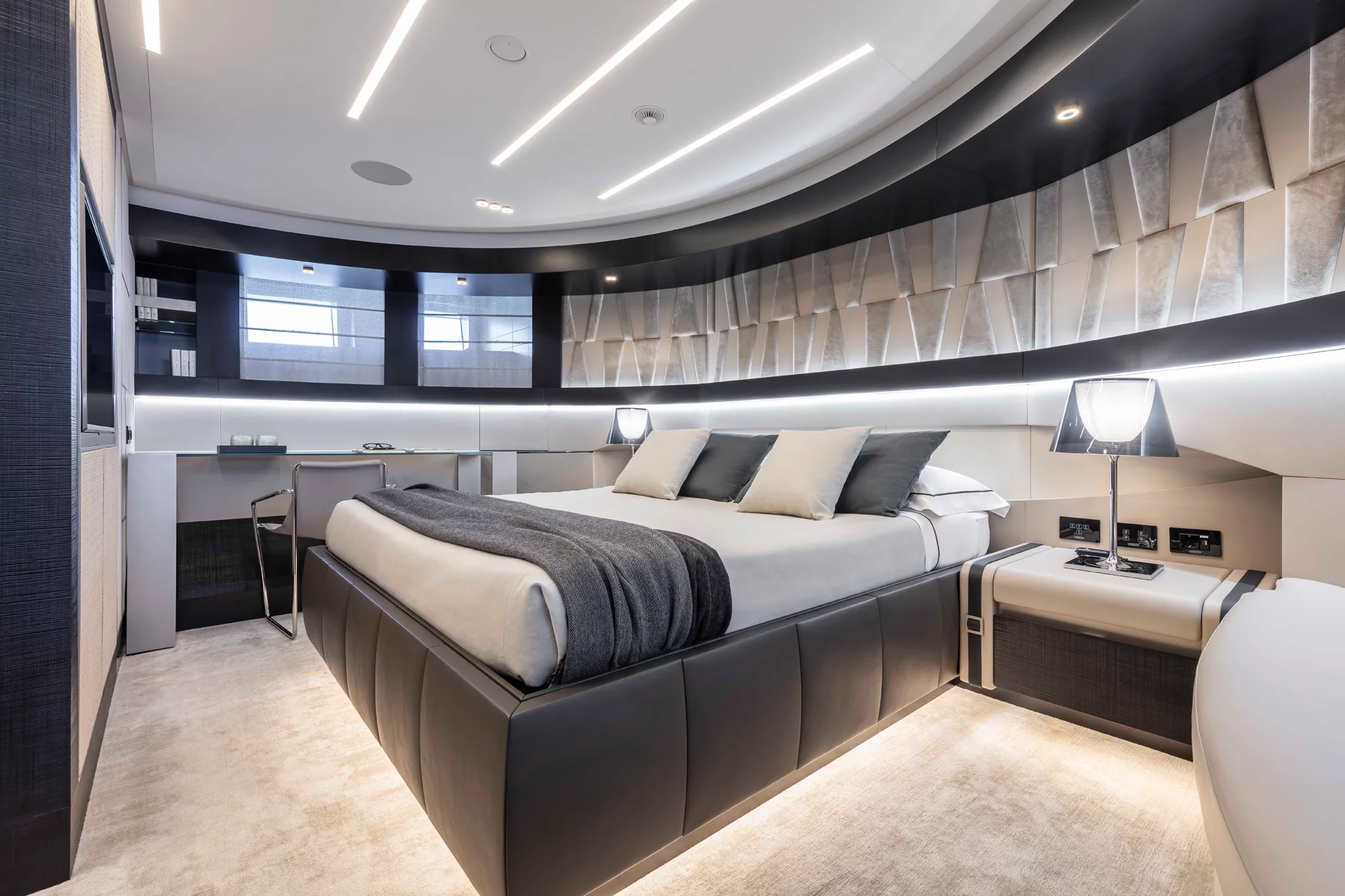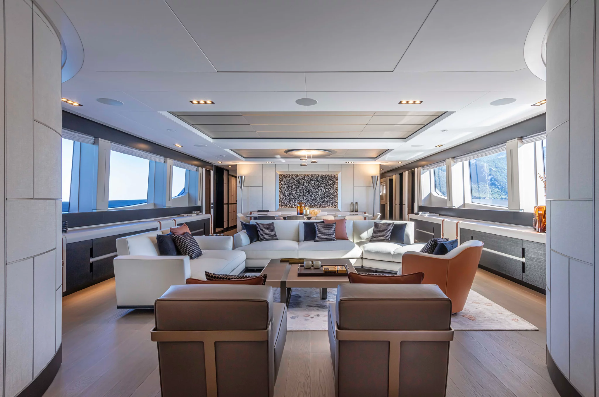 The interior is fully customizable, reflecting the owner's style, with decoration options from luxury brands such as Poltrona Frau, Minotti, and Roche Bobois, ensuring a sophisticated and comfortable onboard environment.