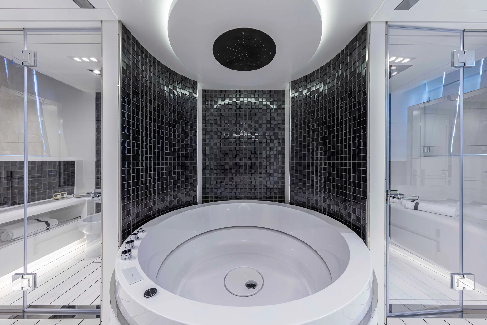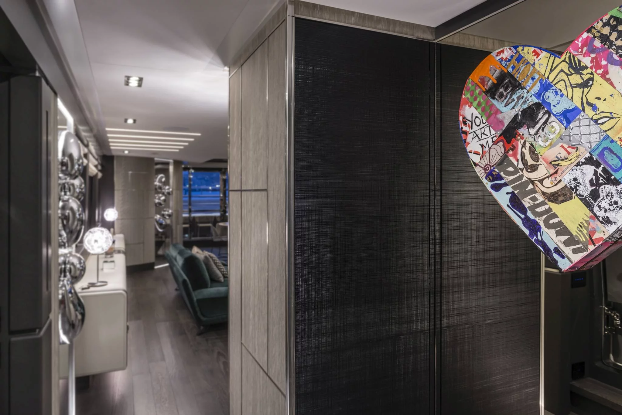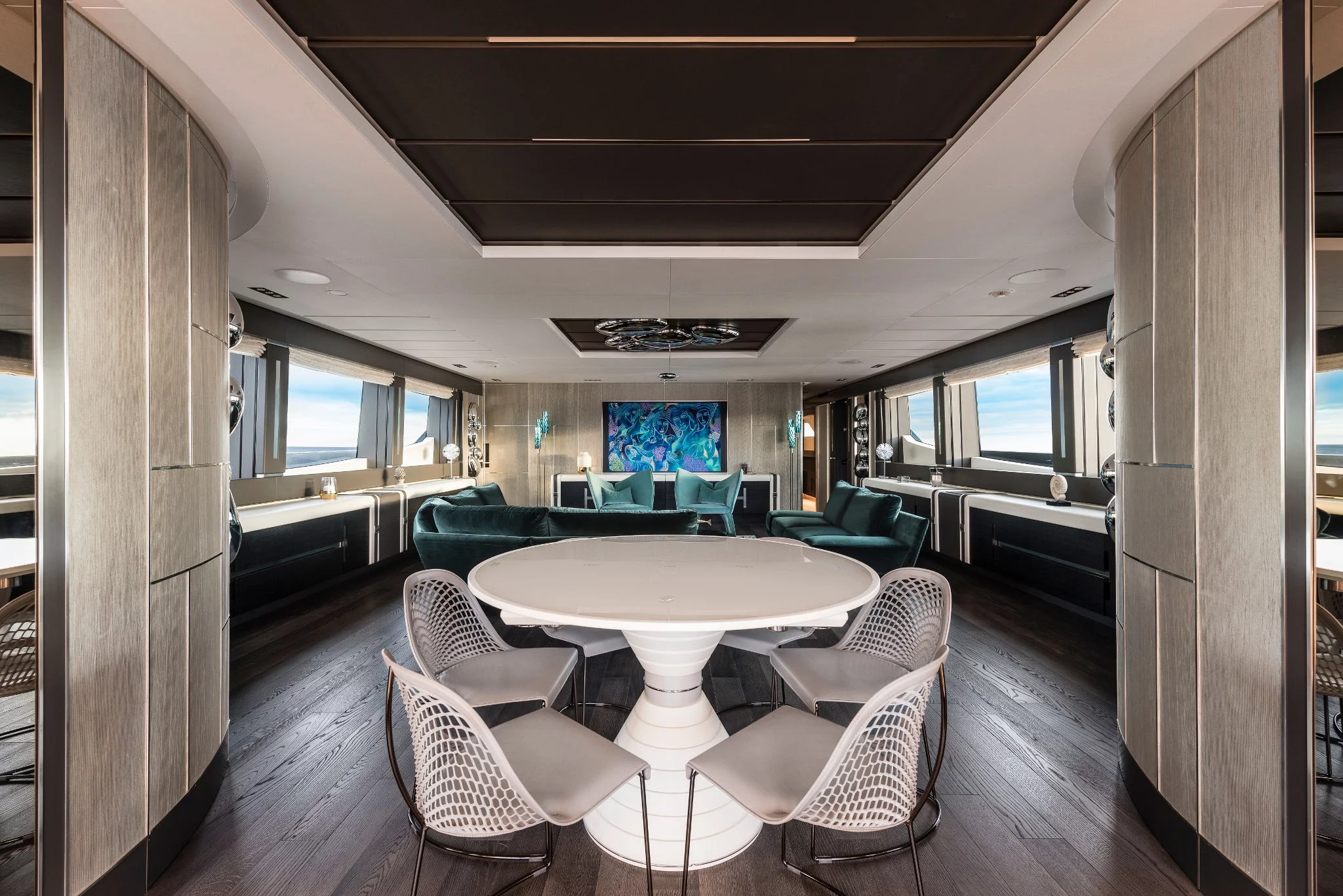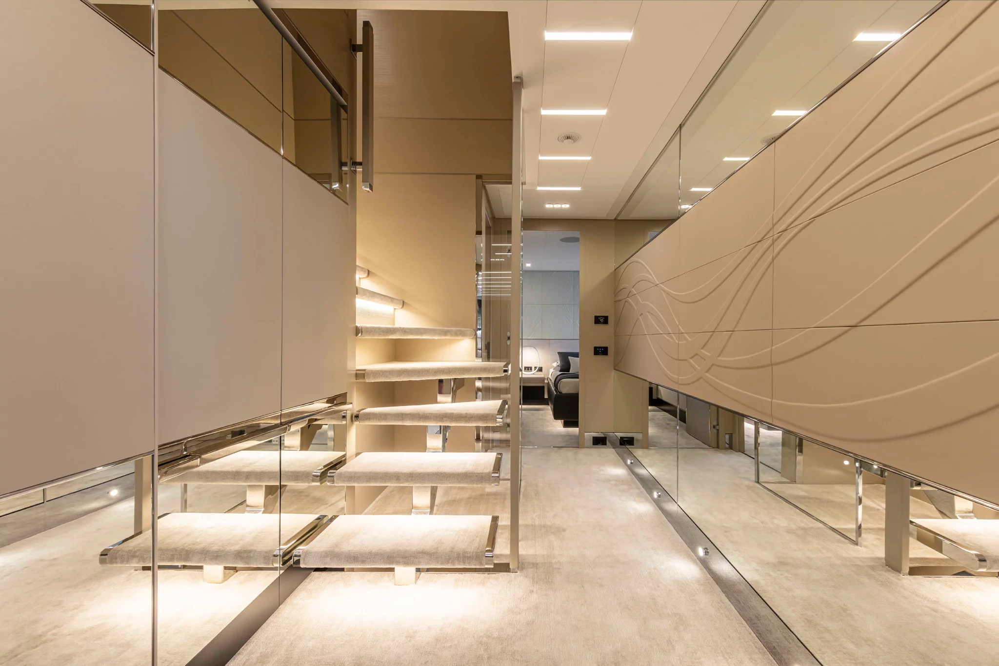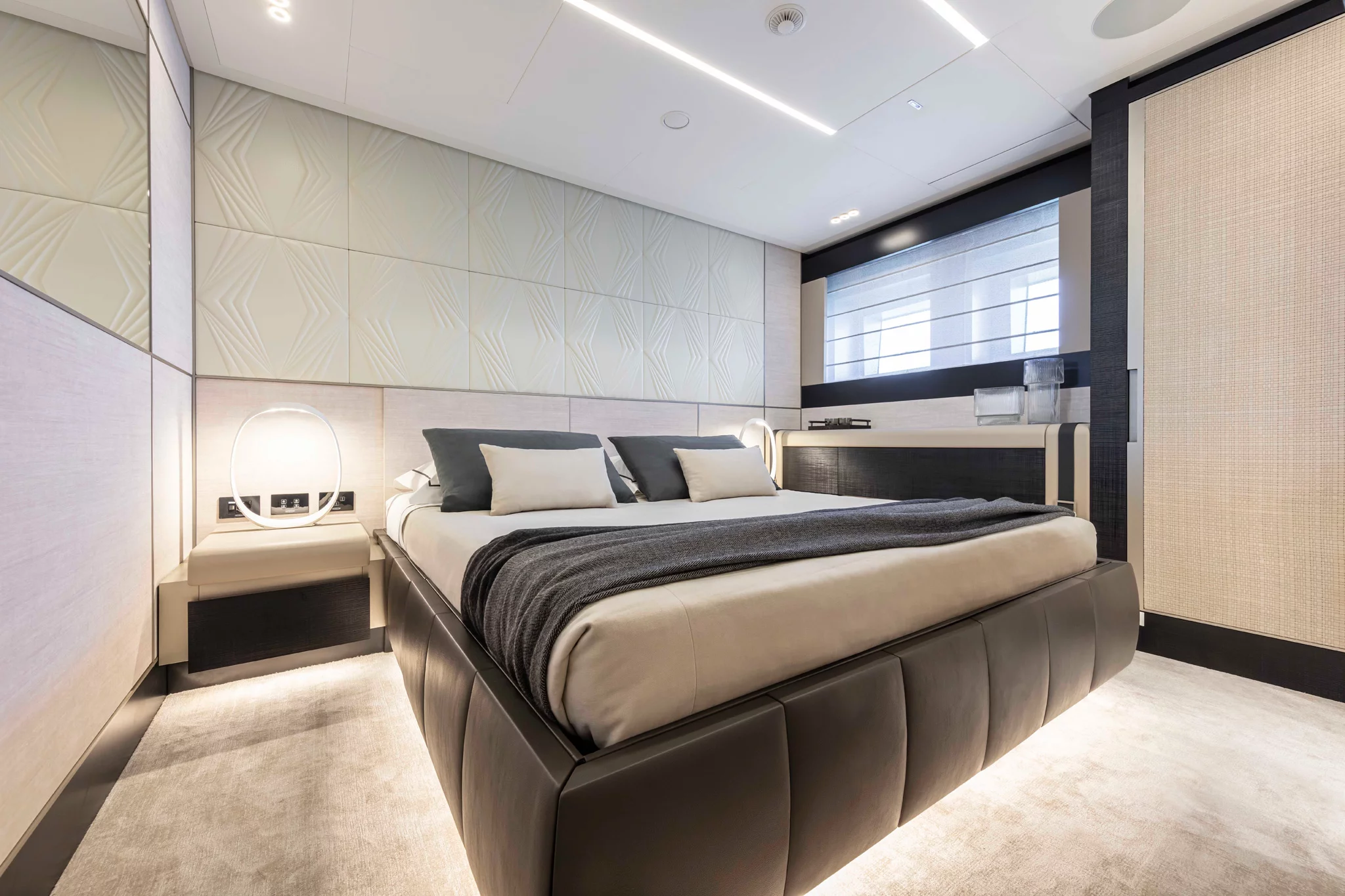 The interior is fully customizable, reflecting the owner's style, with decoration options from luxury brands such as Poltrona Frau, Minotti, and Roche Bobois, ensuring a sophisticated and comfortable onboard environment.