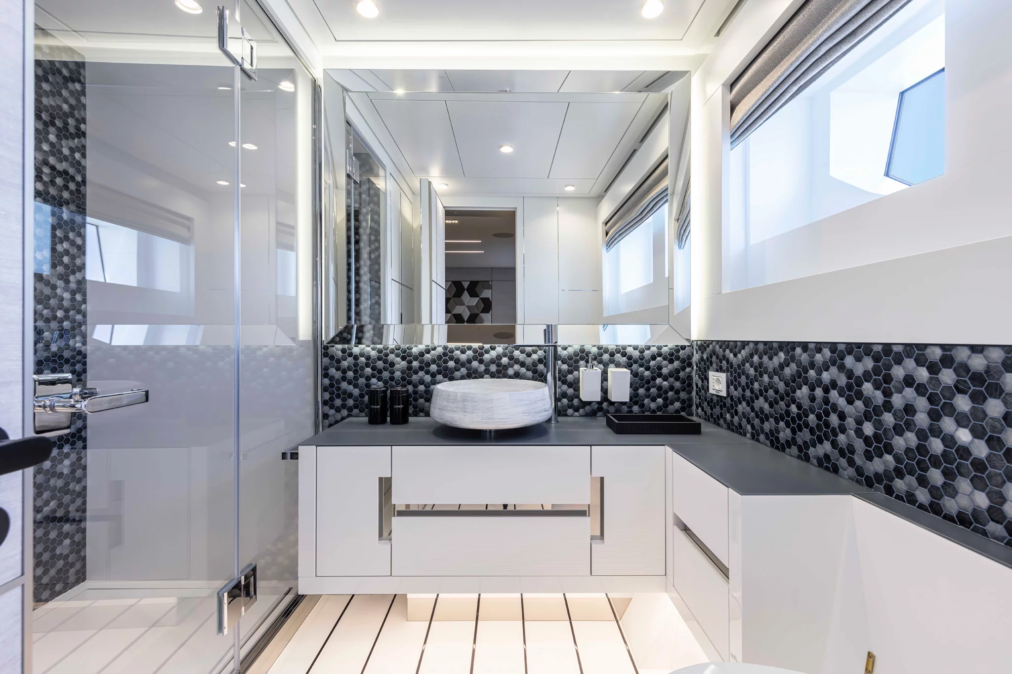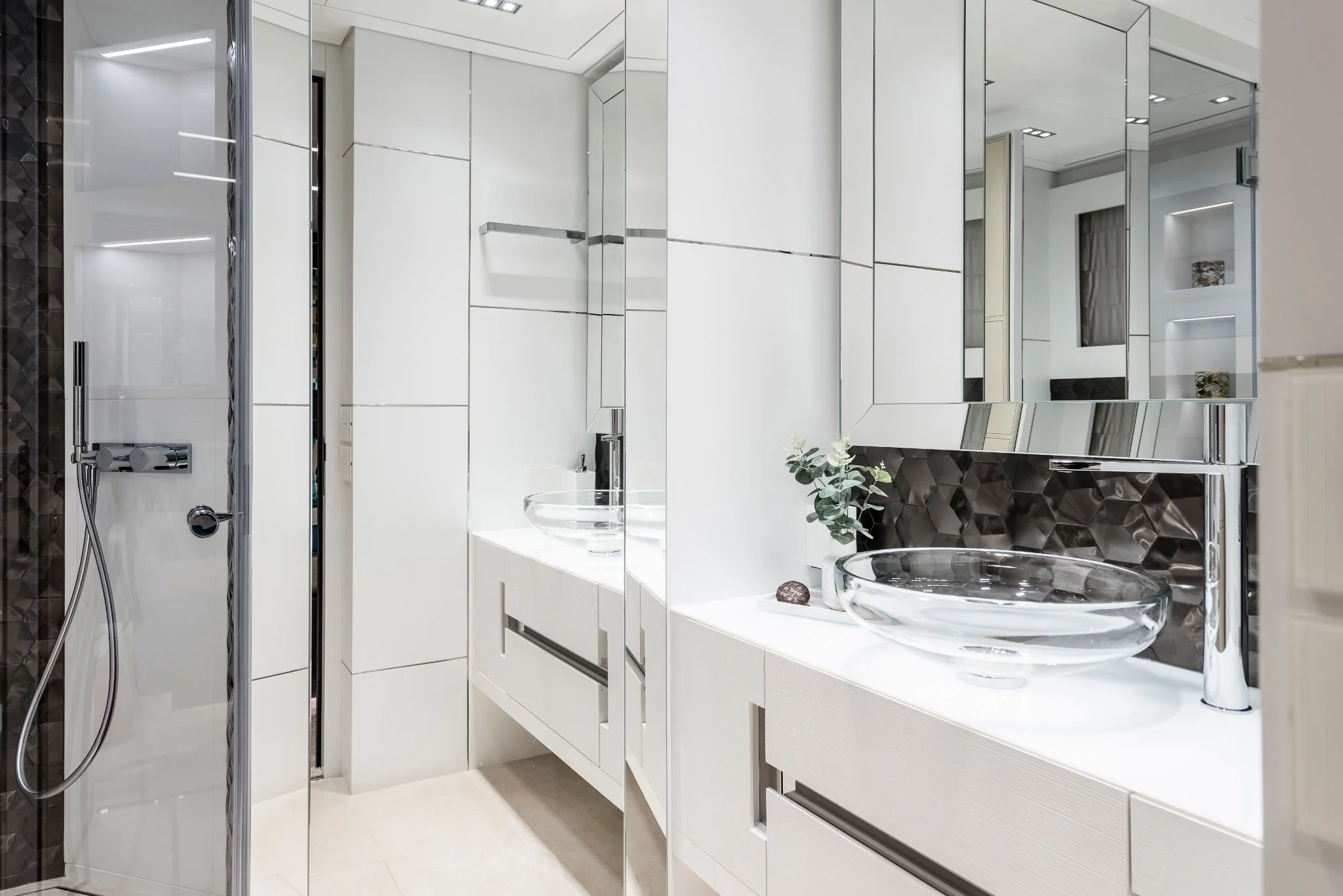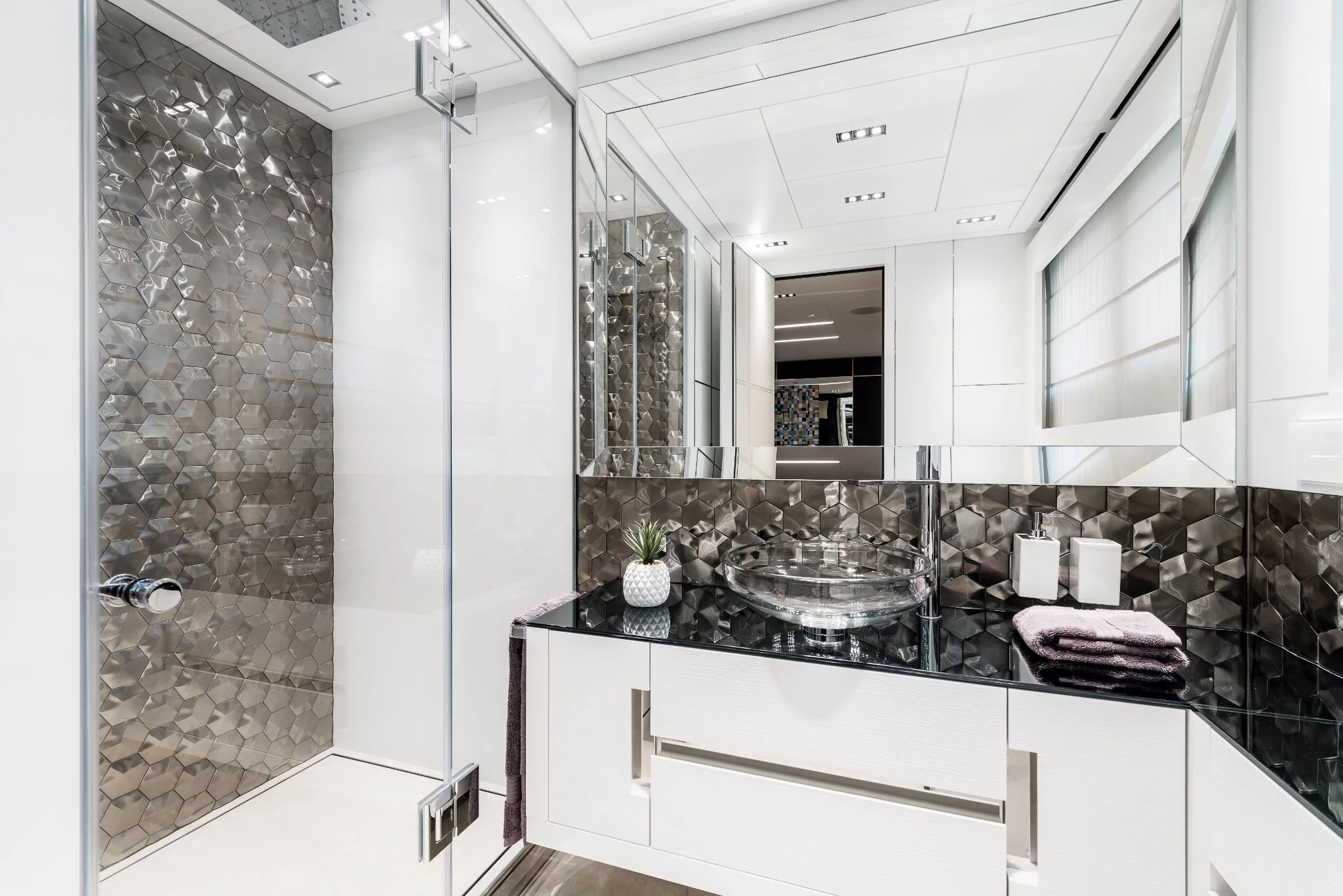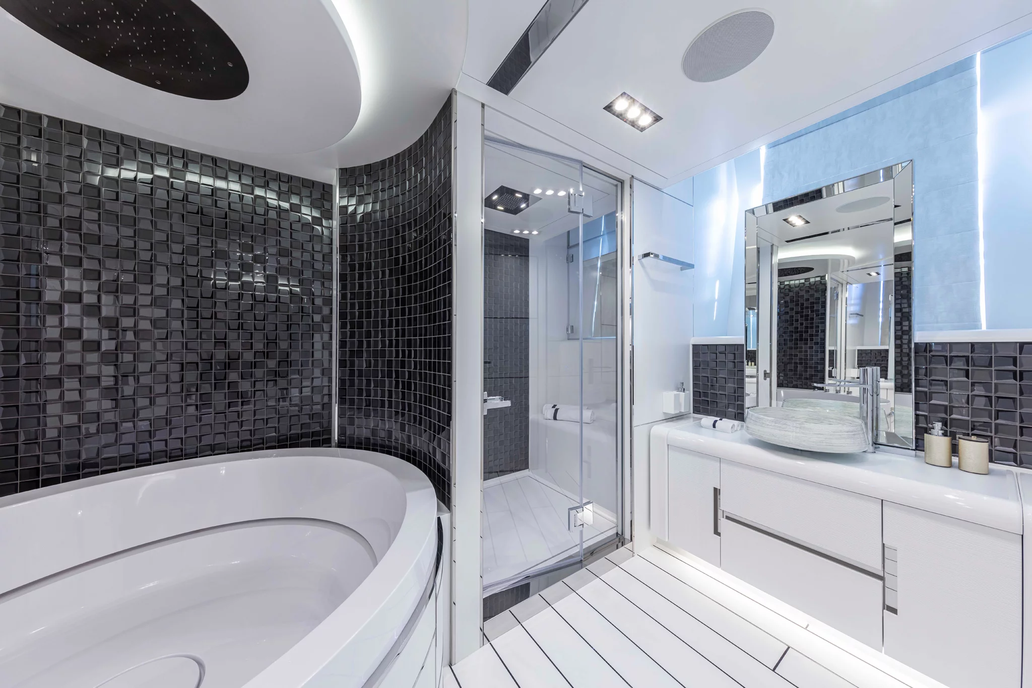 The interior is fully customizable, reflecting the owner's style, with decoration options from luxury brands such as Poltrona Frau, Minotti, and Roche Bobois, ensuring a sophisticated and comfortable onboard environment.
