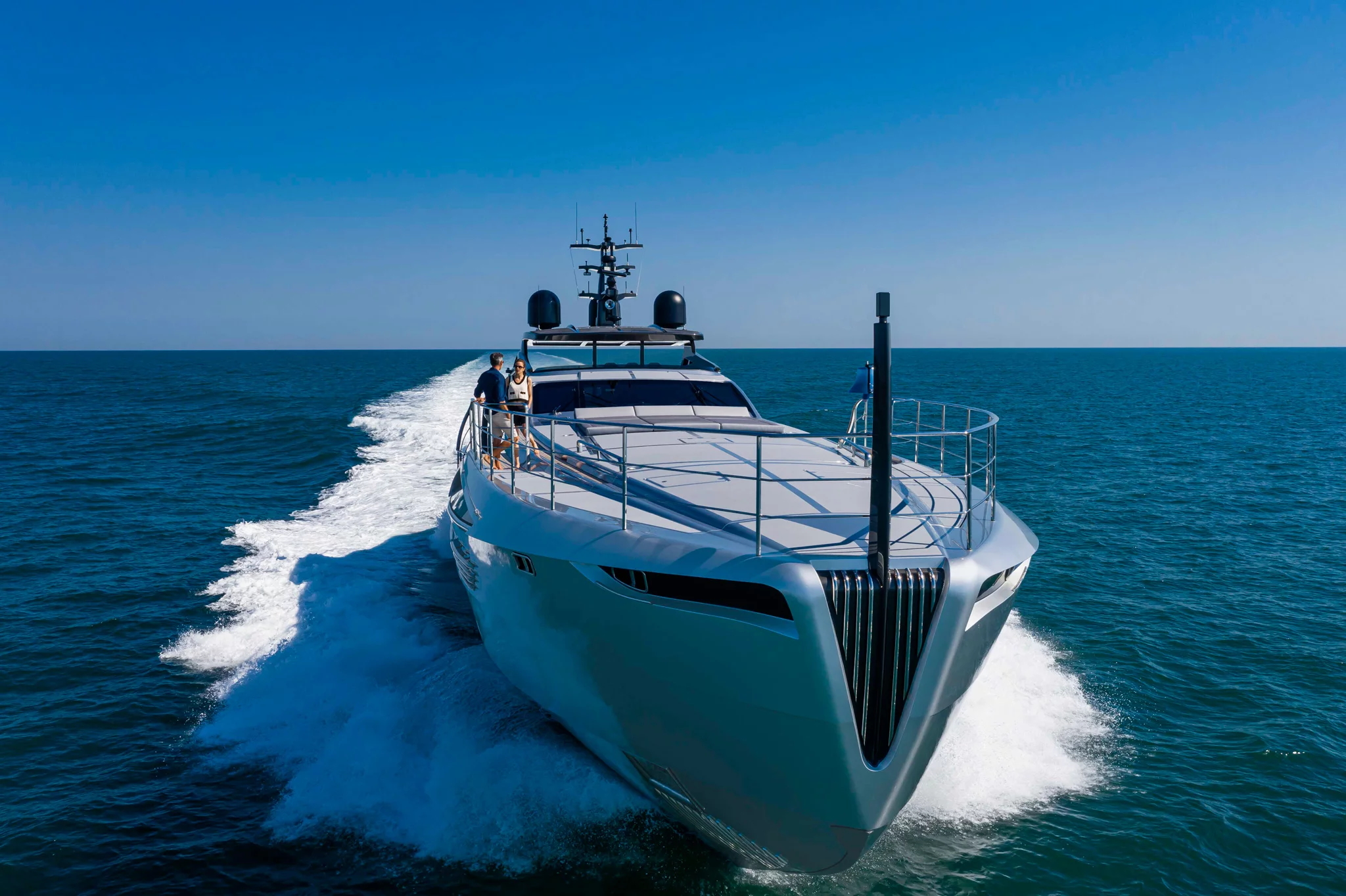 The Pershing 140 is Pershing's flagship yacht, measuring 43.3 meters in length and 8.55 meters in width, entirely built in aluminum, standing out for its sporty design and aerodynamic lines.