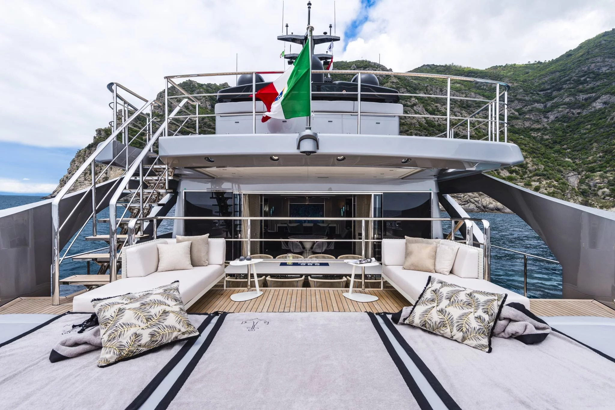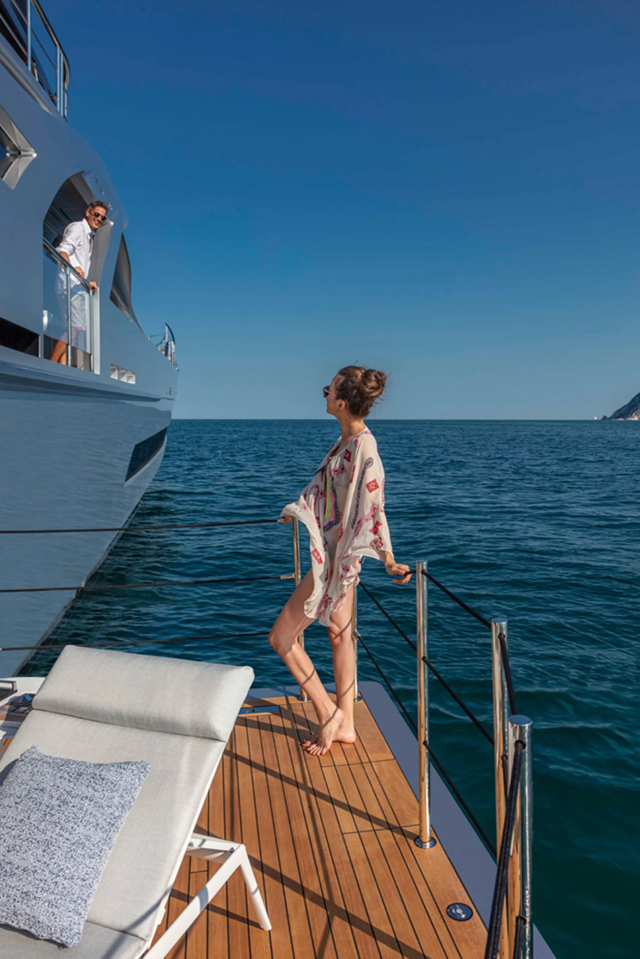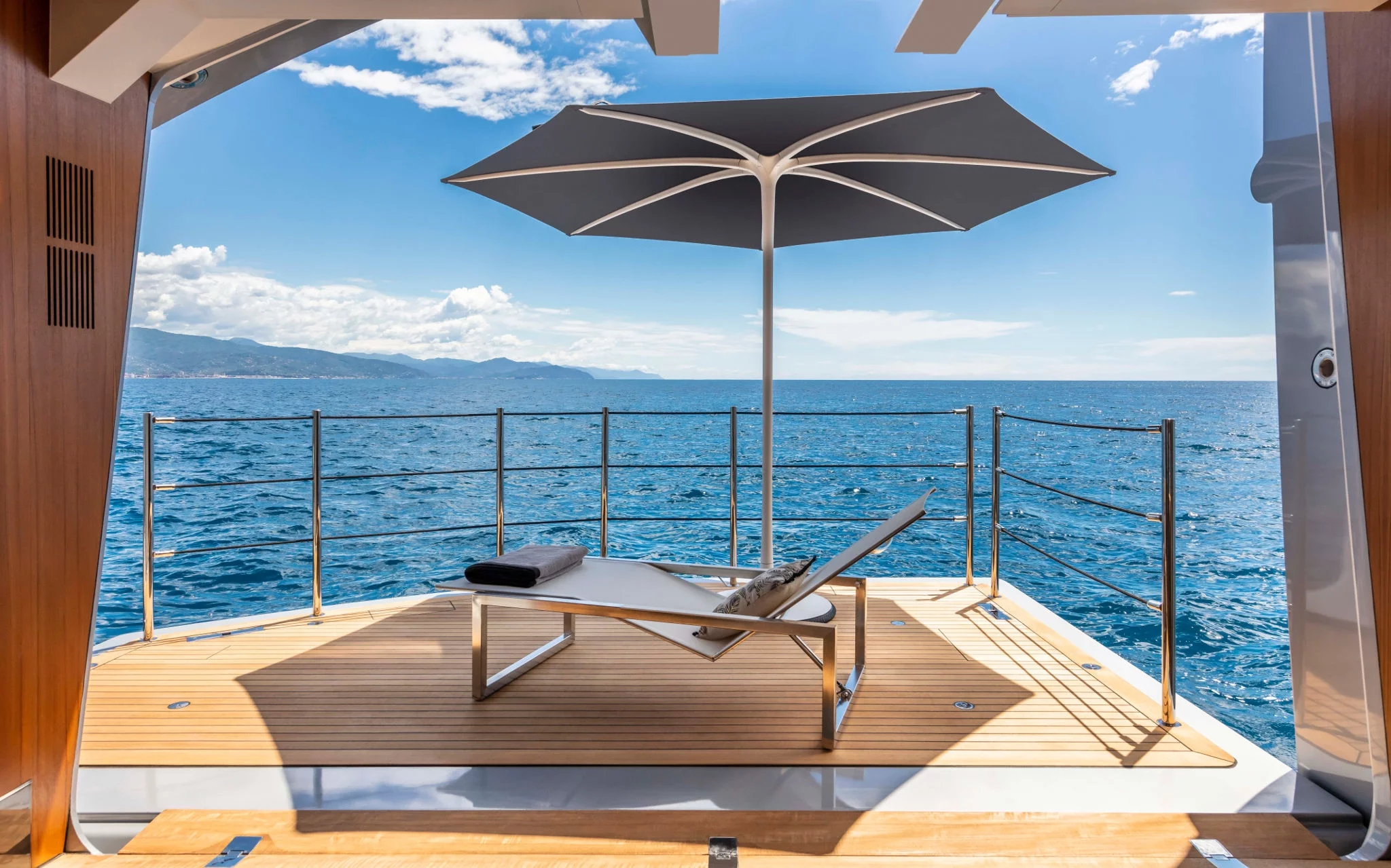 The innovative design features a raised cockpit directly connected to the upper deck, a dedicated owner's area on the main deck, and an expandable beach club with three lateral platforms, providing ample leisure and entertainment spaces.