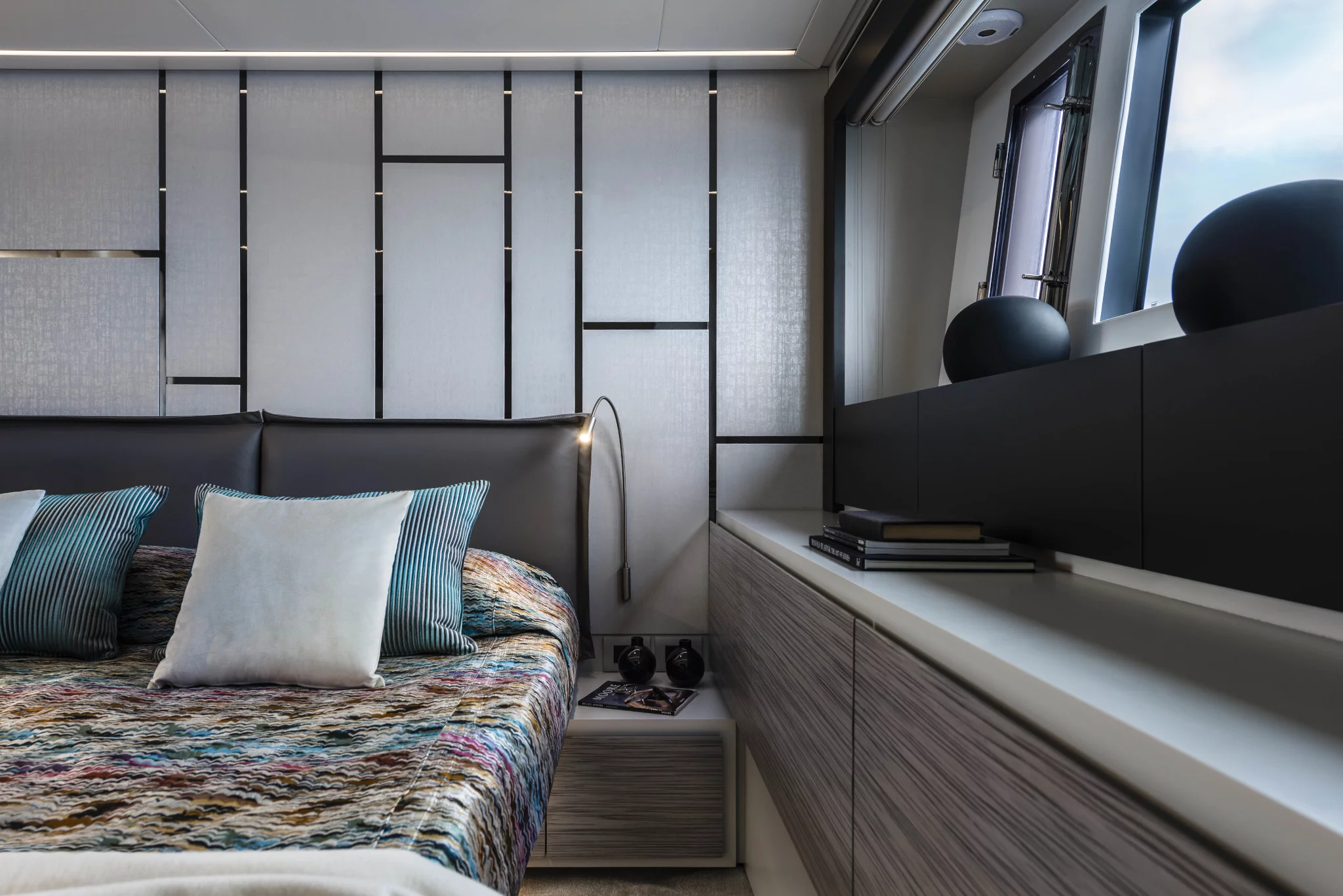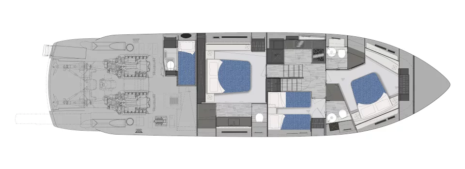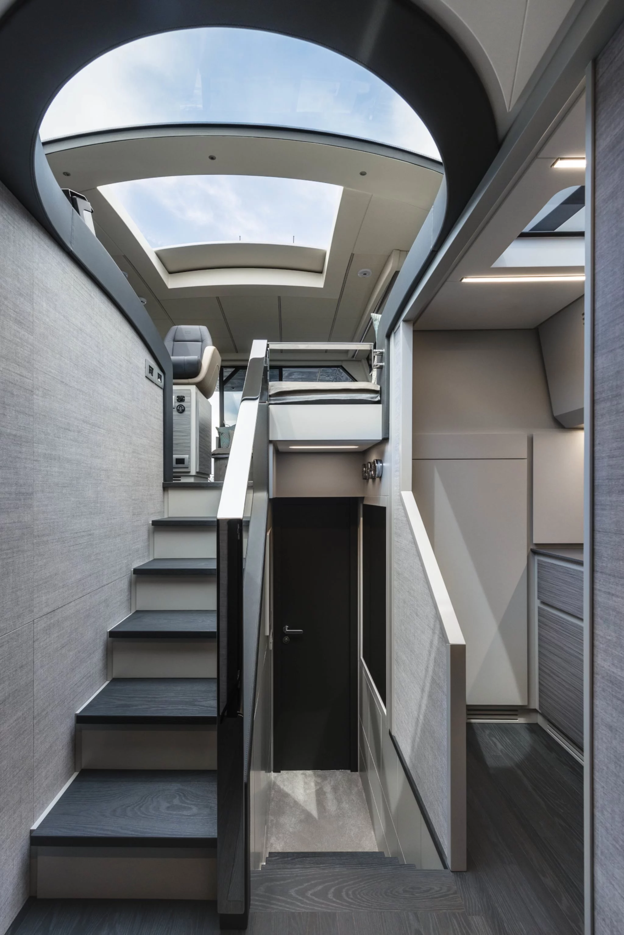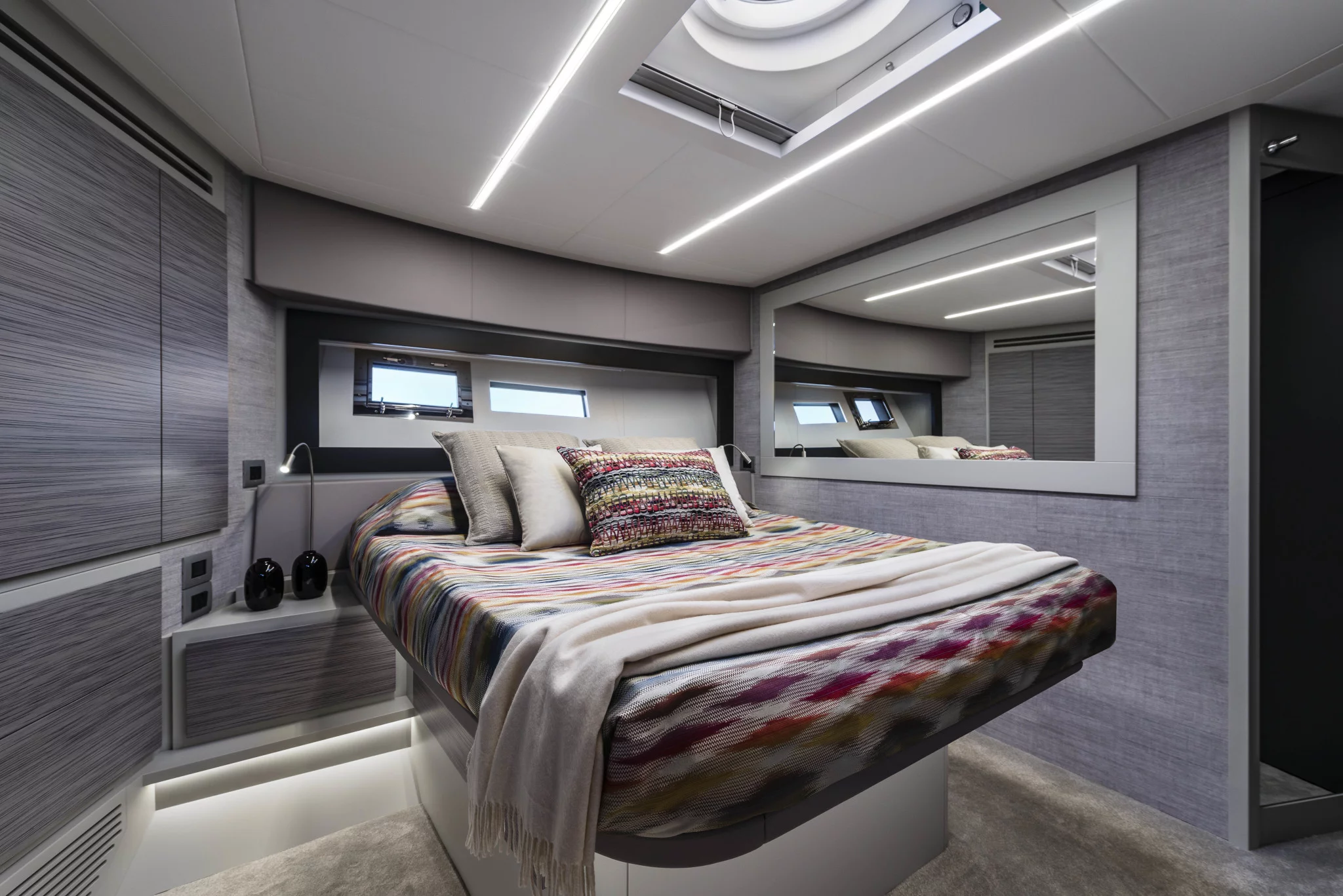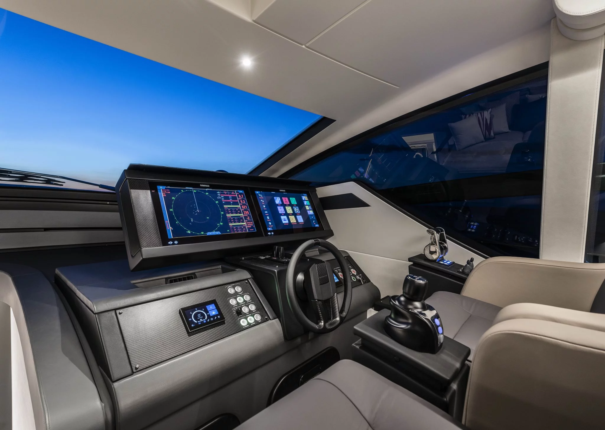 The interior features large panoramic windows, allowing abundant natural light into the below-deck spaces. The layout includes a master suite, a VIP cabin, and a guest cabin, all with en-suite bathrooms. The cockpit boasts sliding glass doors that seamlessly integrate the indoor and outdoor areas, creating a spacious and versatile environment. The Pershing 6X incorporates advanced navigation and control technologies, ensuring precise and safe handling. This model embodies the boldness and innovation of Pershing’s "X Generation," combining luxury, comfort, and cutting-edge performance.
