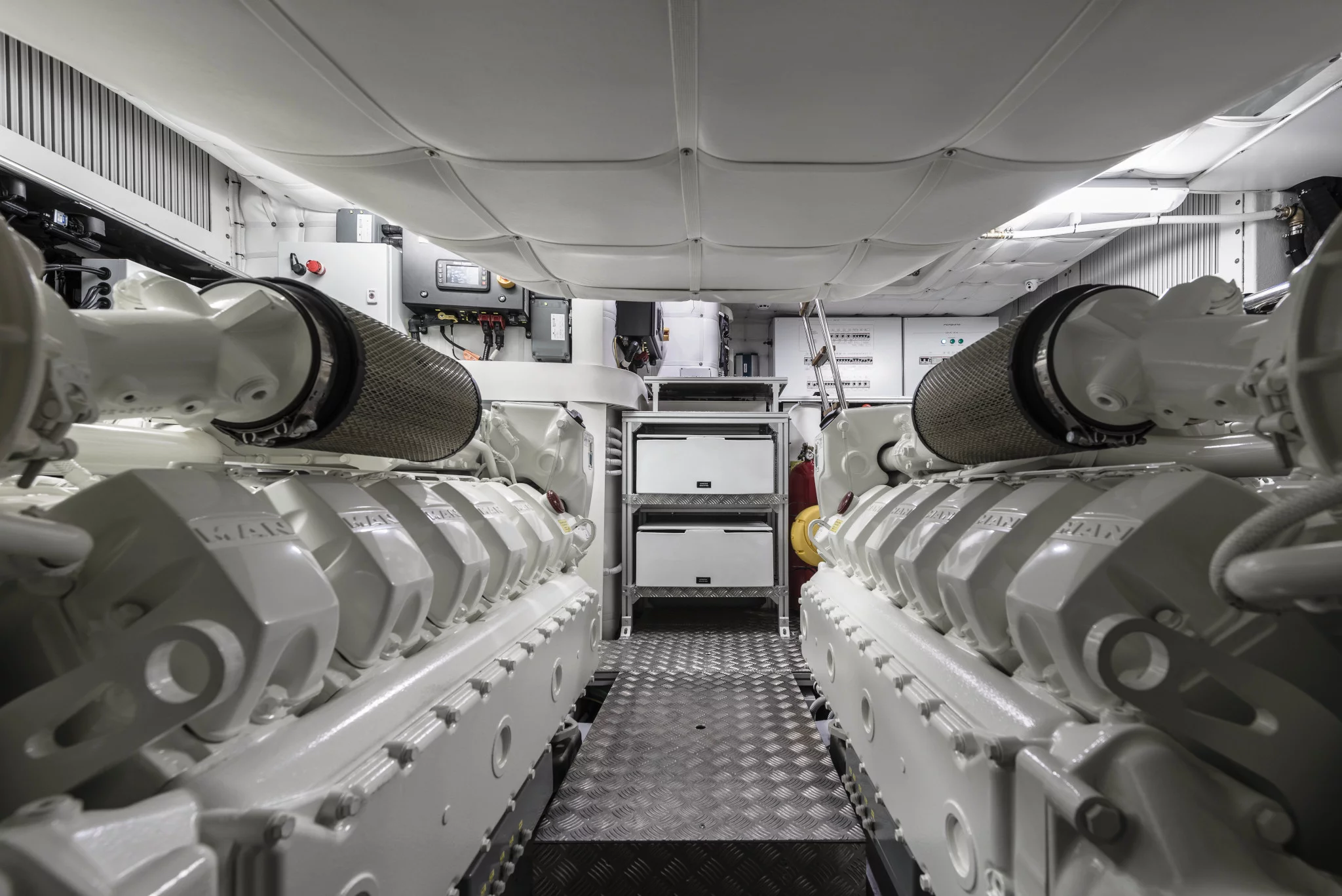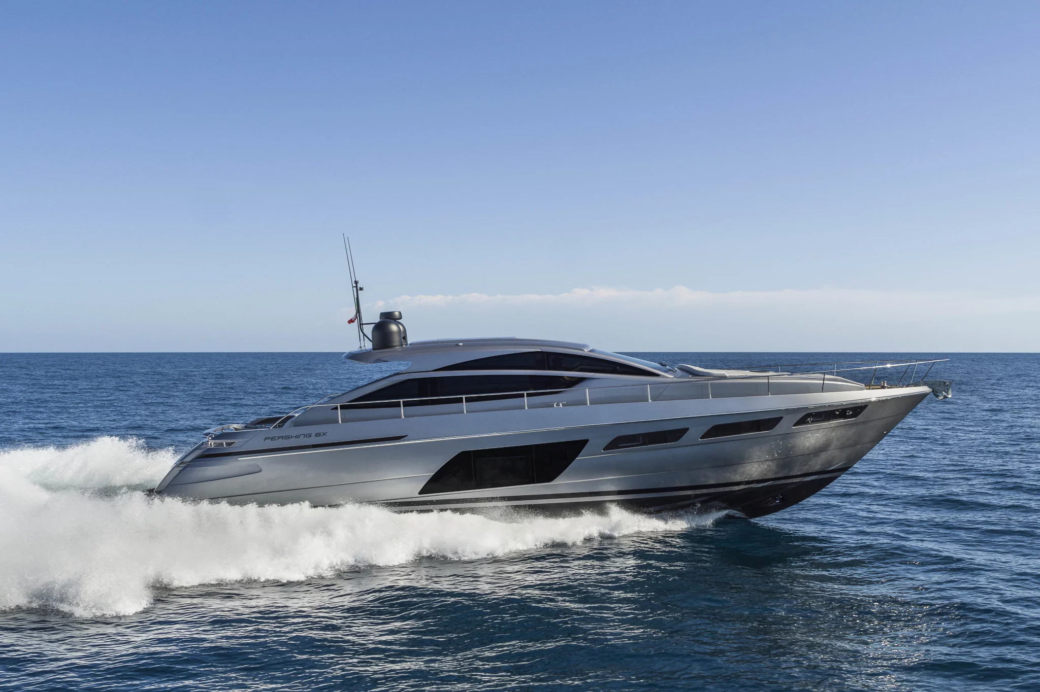 The Pershing 6X is a luxury yacht measuring 18.94 meters in length and 4.80 meters in beam, renowned for its aerodynamic design and elegant lines. Powered by twin MAN V12 engines delivering 1,550 HP each, it reaches a top speed of 48 knots and cruises comfortably at 42 knots, ensuring exceptional performance.
