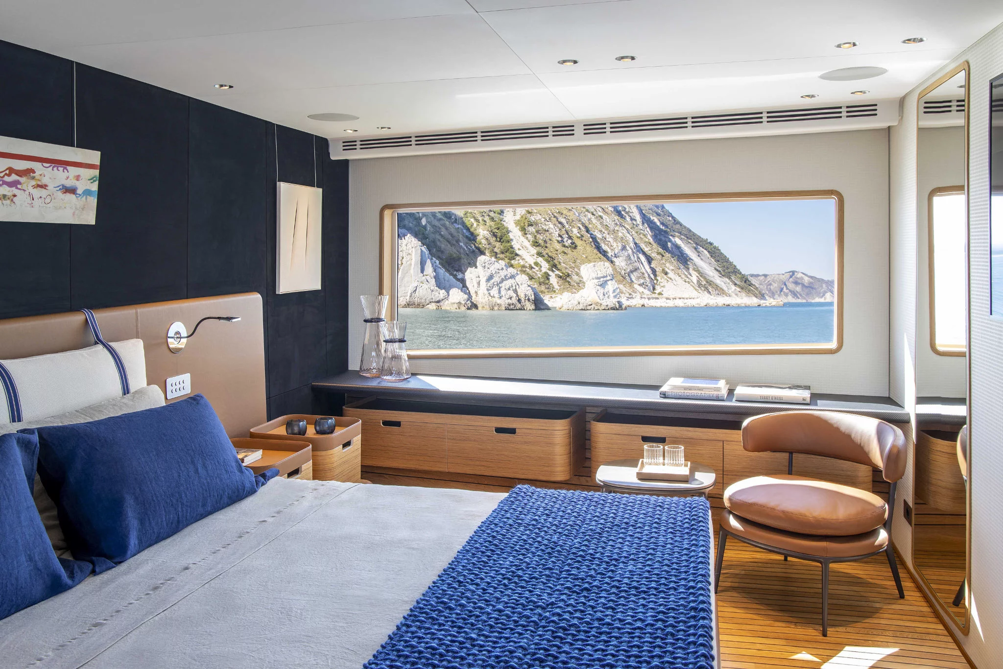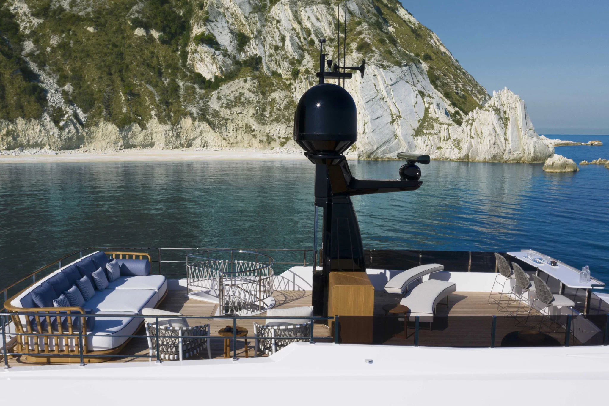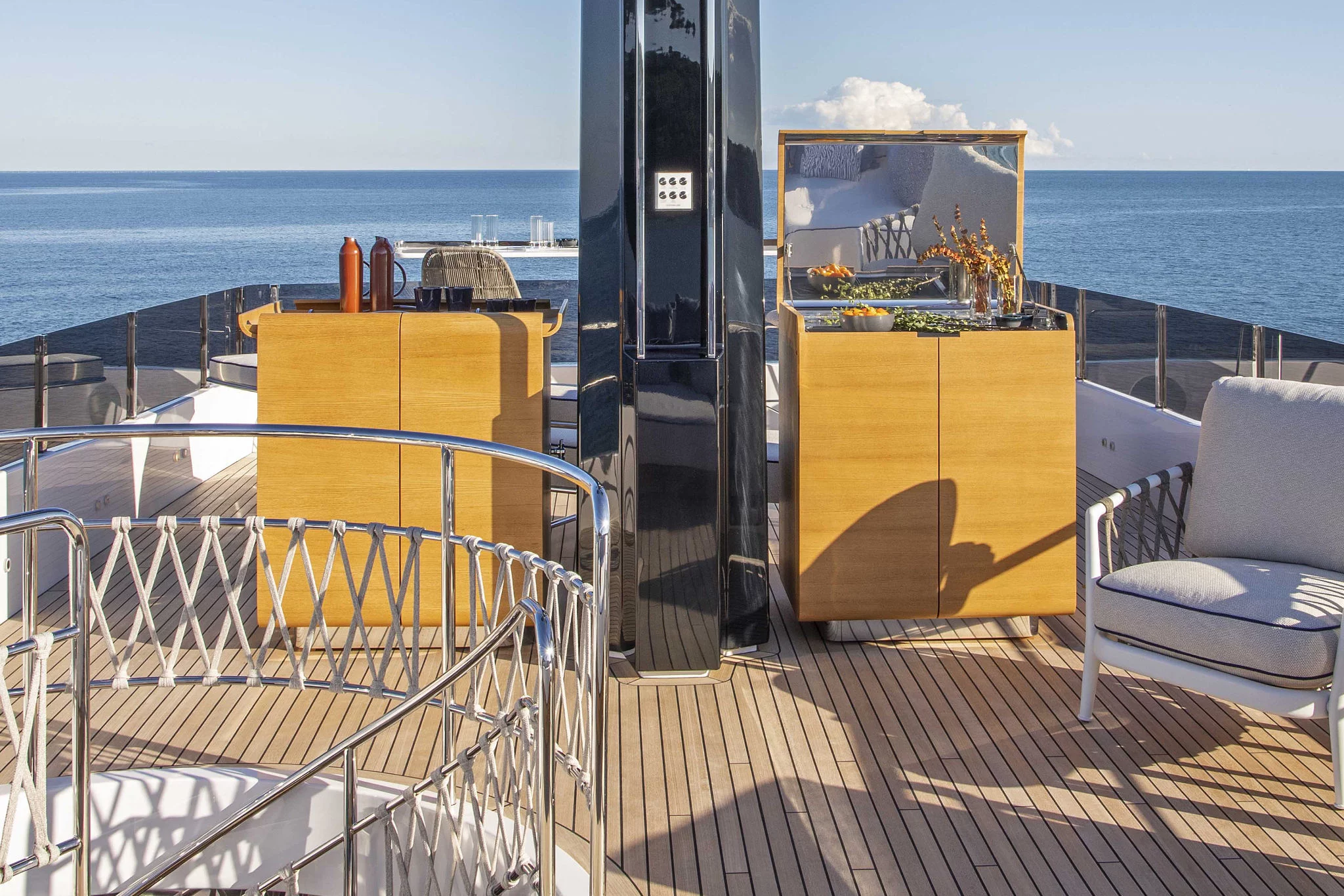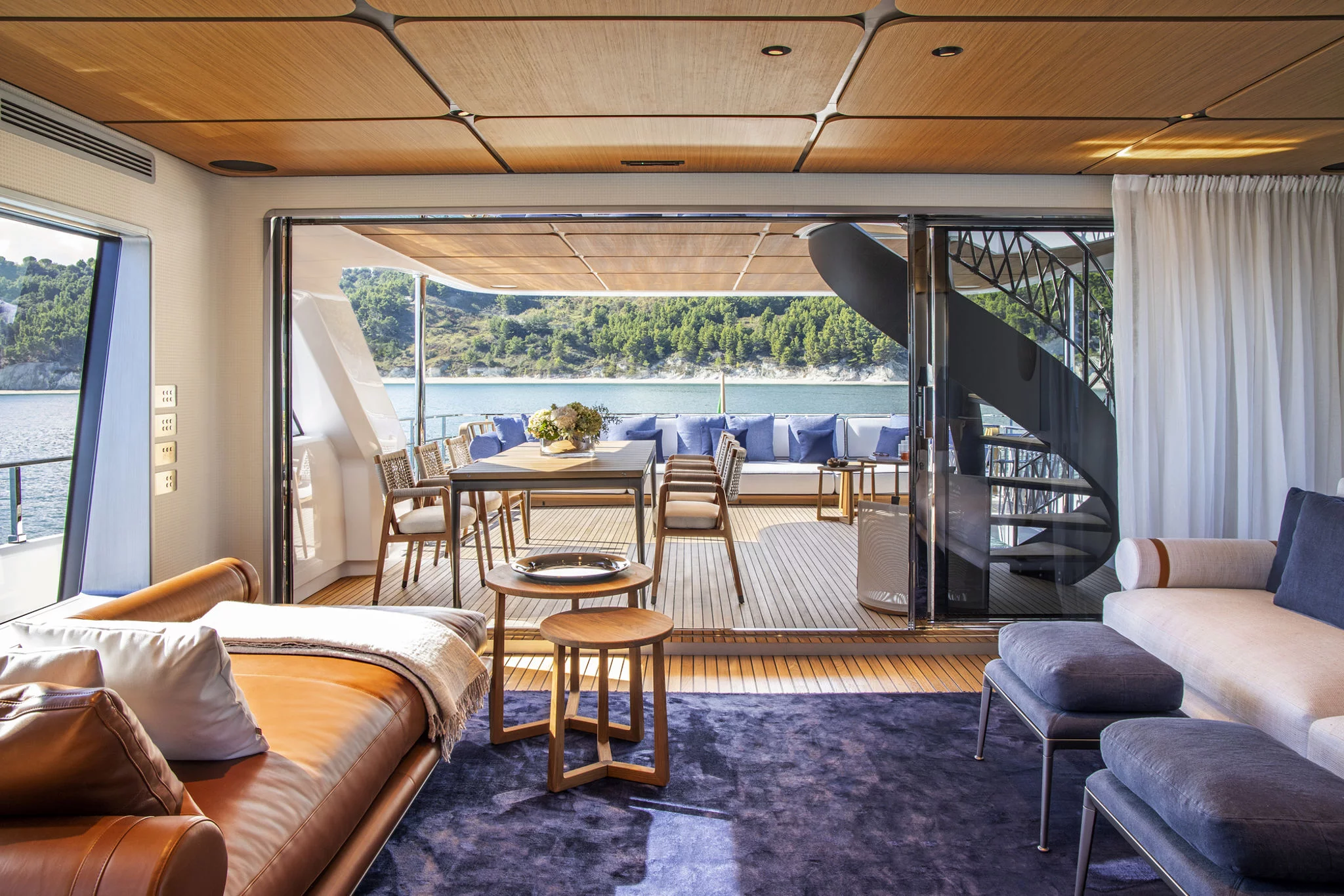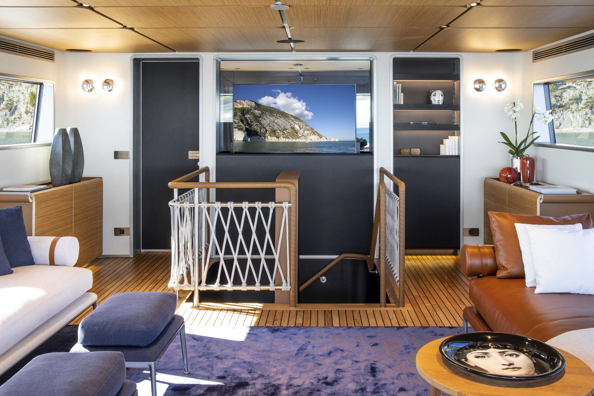 O projeto exterior é assinado pelo arquiteto Filippo Salvetti, enquanto o design interior é da responsabilidade do estúdio de arquitetura Antonio Citterio Patricia Viel. O iate dispõe de três decks, oferecendo amplos espaços exteriores e interiores, incluindo uma suíte principal no deck principal e quatro cabines adicionais no deck inferior, acomodando até 10 convidados. Grandes janelas panorâmicas proporcionam vistas deslumbrantes e abundante luz natural.
