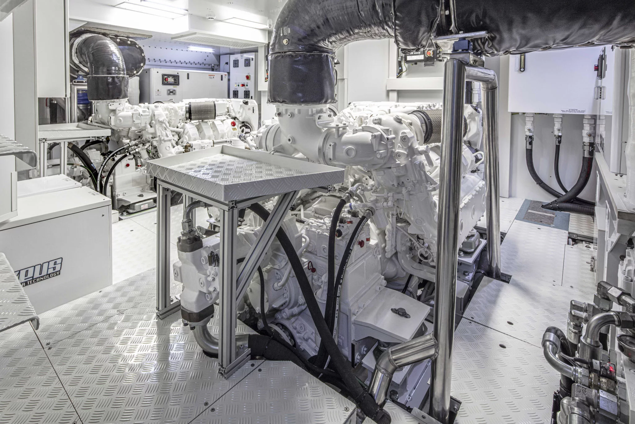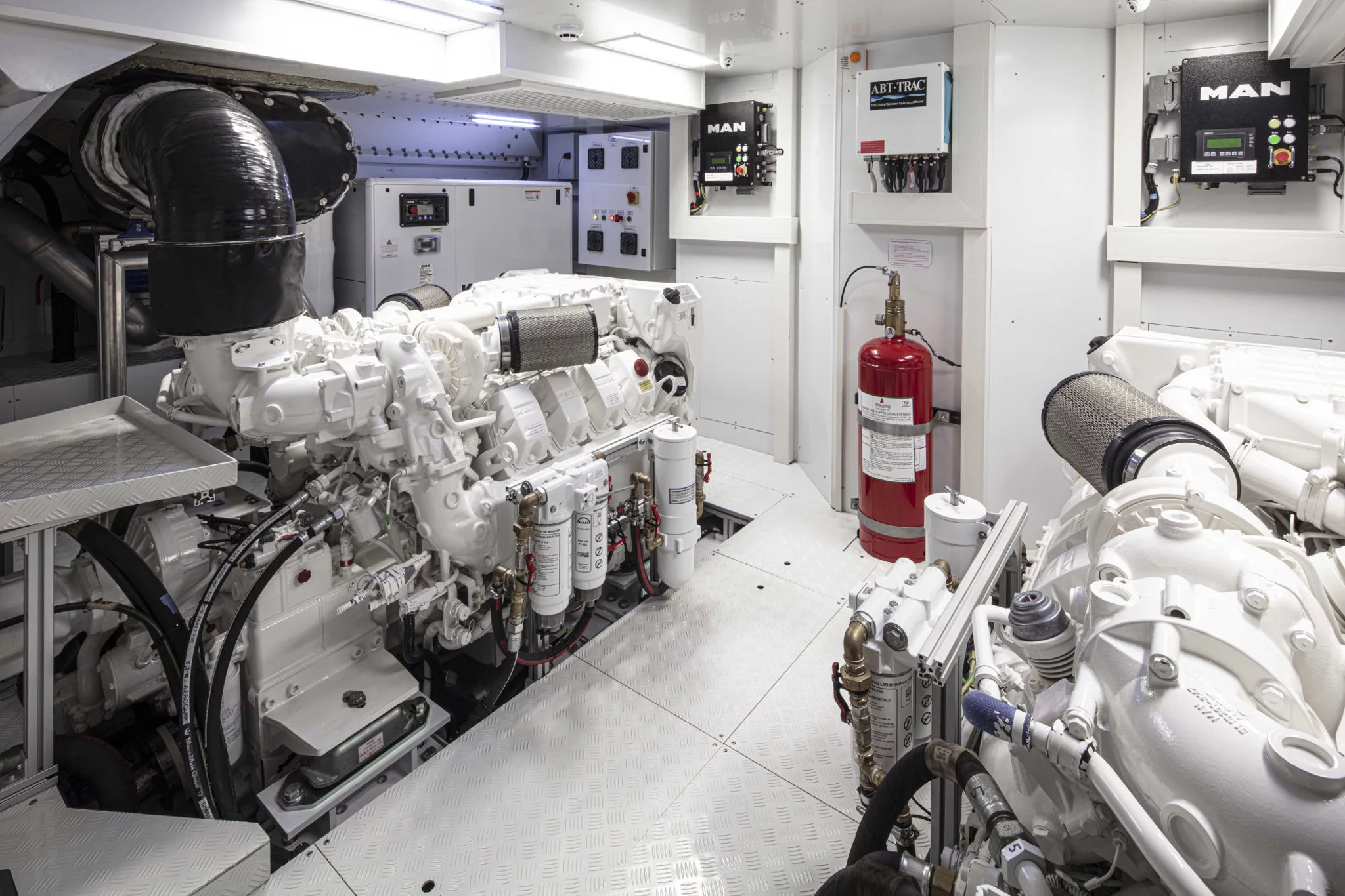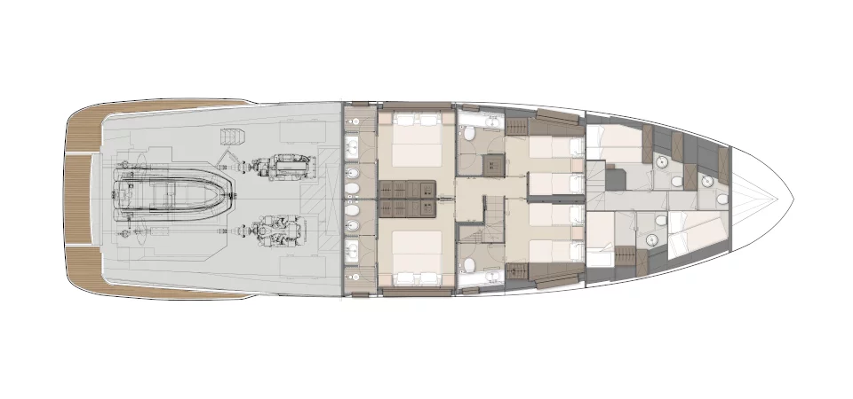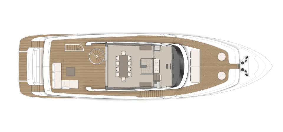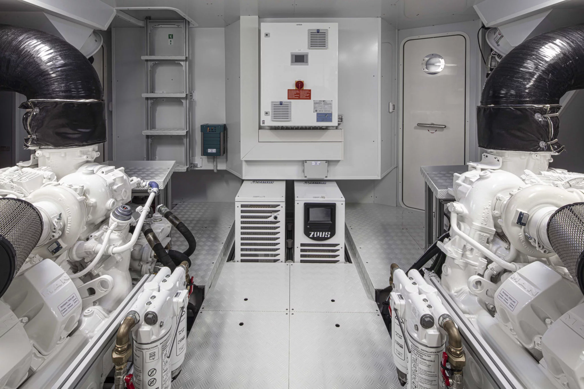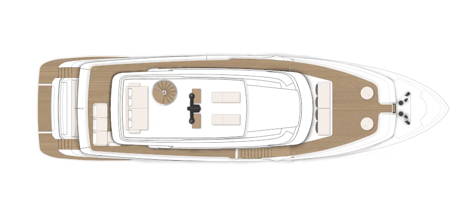 Equipado com motores MAN, o Navetta 30 atinge uma velocidade máxima de 14,5 nós e uma autonomia de até 2.050 milhas náuticas a 10 nós, assegurando desempenho eficiente e confortável em longas travessias.