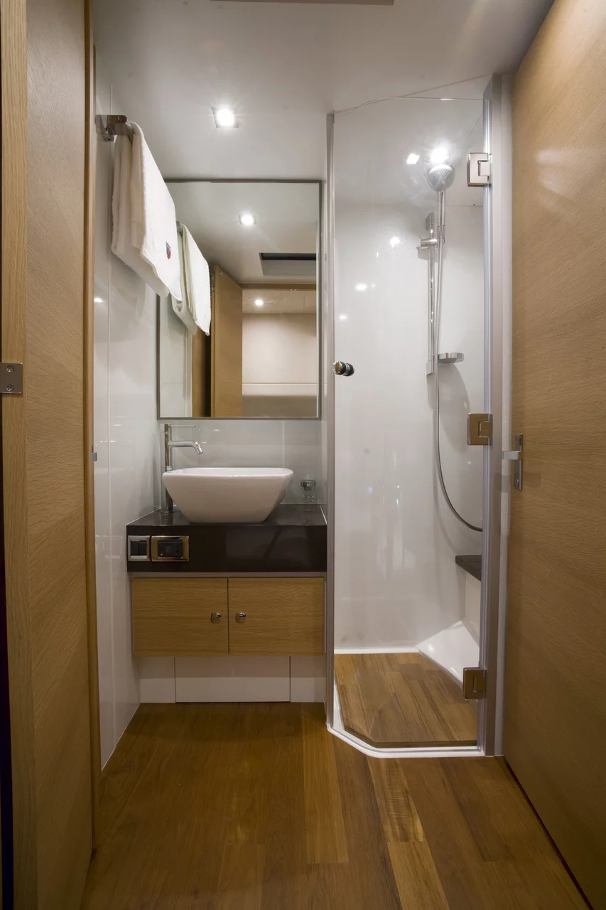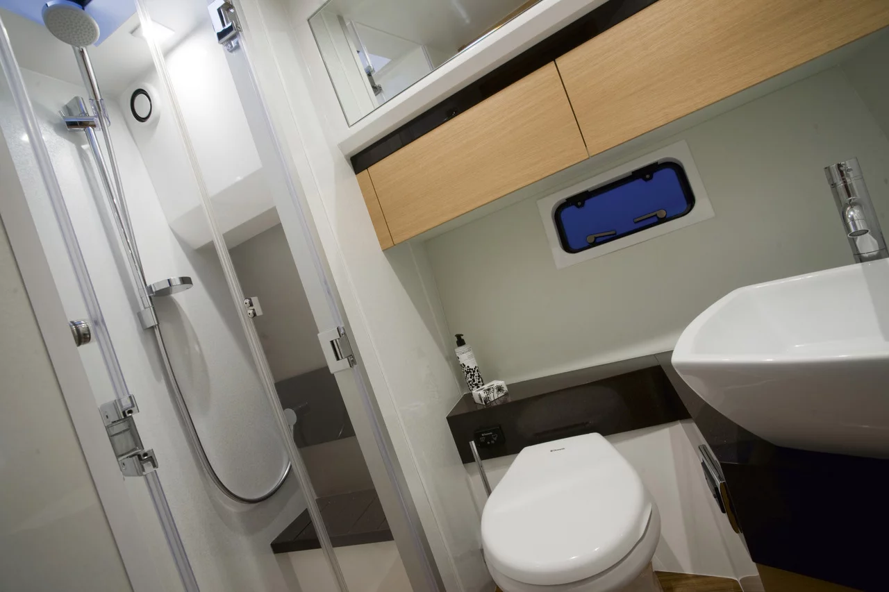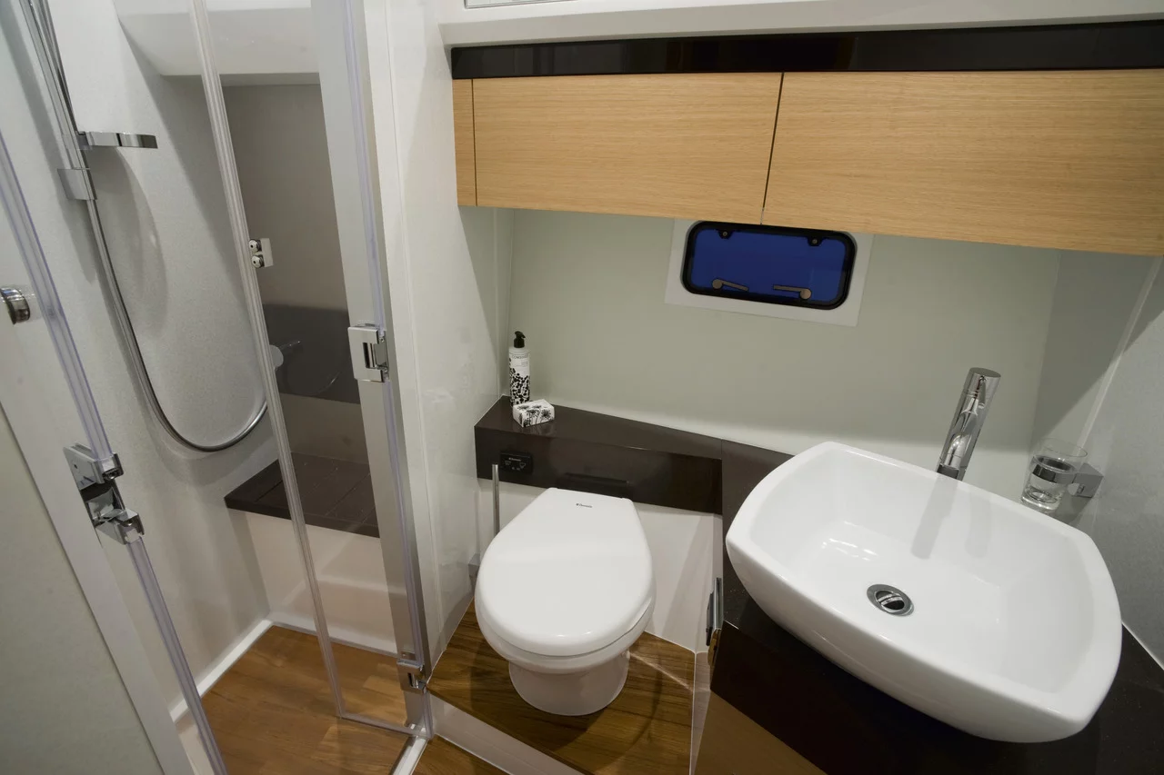 The backseat converts into a rear-facing lounger to create a sociable terrace area and to watch over those taking a swim. The walk-around side decks mean you can move to the front of the yacht easily and safely. Inside, the starboard guest cabin’s en suite has two doors that open wide to give the room a more opulent and spacious feel.