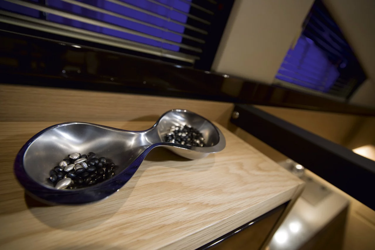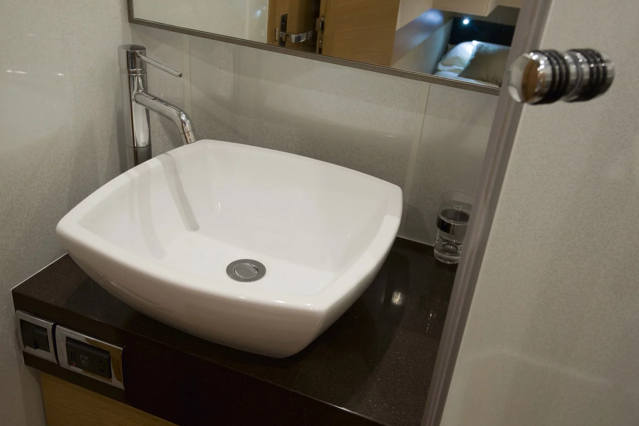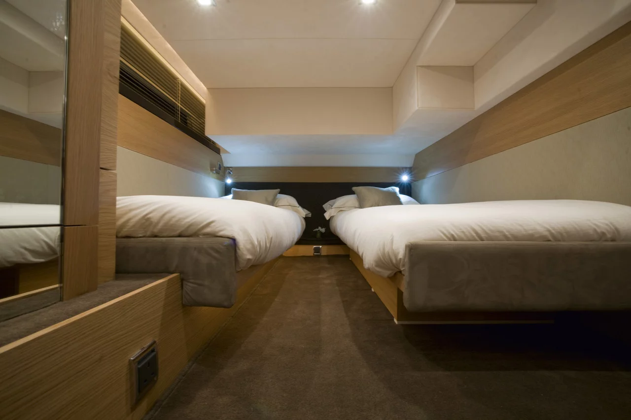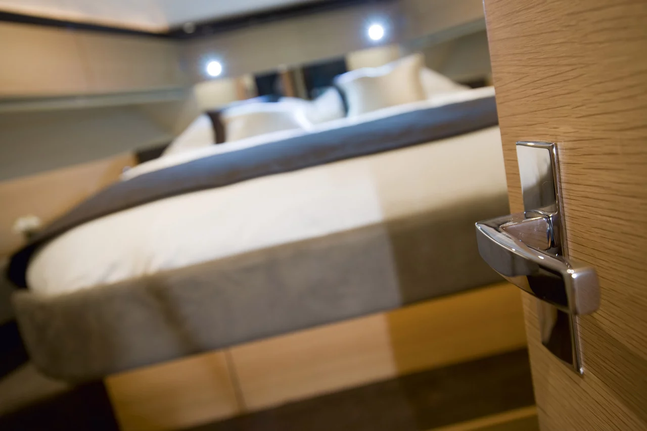 The backseat converts into a rear-facing lounger to create a sociable terrace area and to watch over those taking a swim. The walk-around side decks mean you can move to the front of the yacht easily and safely. Inside, the starboard guest cabin’s en suite has two doors that open wide to give the room a more opulent and spacious feel.