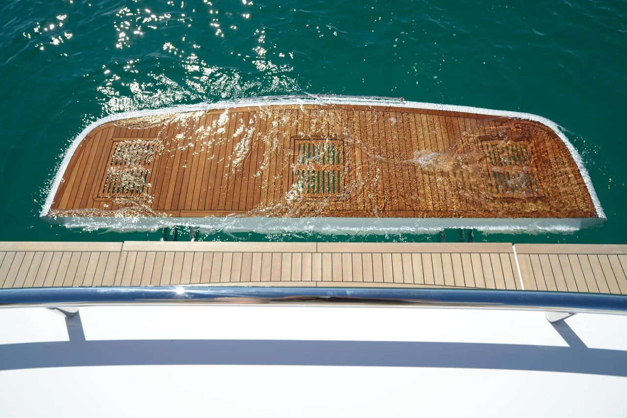 Large panoramic windows add to the sense of light and space in the generously well appointed saloon. Moving out onto the cockpit you can take a seat or stretch out on the large sunpad, with the luxury of being able to control how much sunlight you get by simply activating the powered retractable cockpit cover. The integral garage is home for the optional jet tender and the option list extends to a hydraulic passerelle and a submersible powered bathing platform.