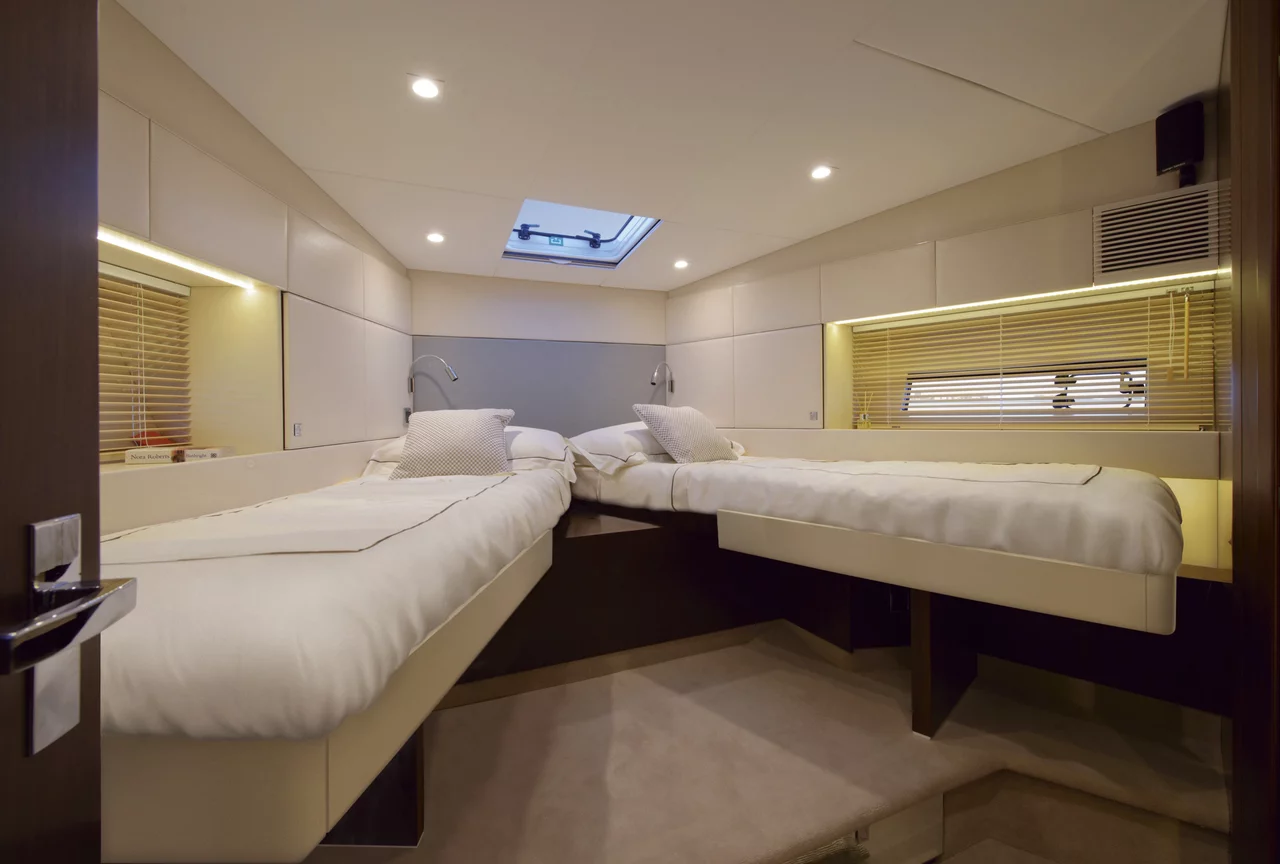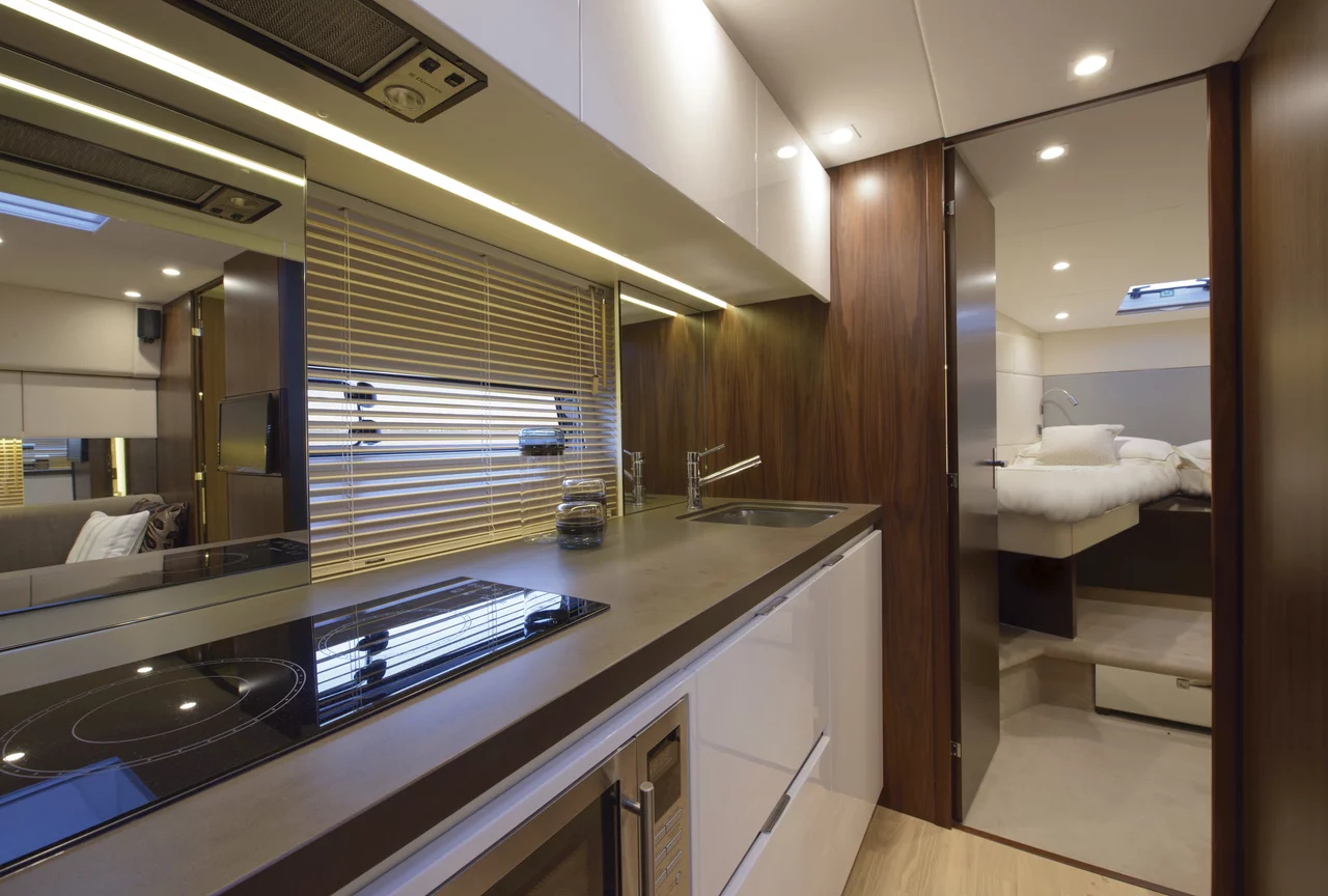 There’s space, and lots of it. Beautifully considered sociable areas, luxurious and stunning in their simplicity. The cabin layout features a fabulous mid master with an optional sofa that converts into an additional bed, there’s a forward double cabin that can convert to a V-berth and the option of a third cabin in lieu of a dinette. The perfectly formed galley enjoys a tall fridge/freezer and pull out larder.